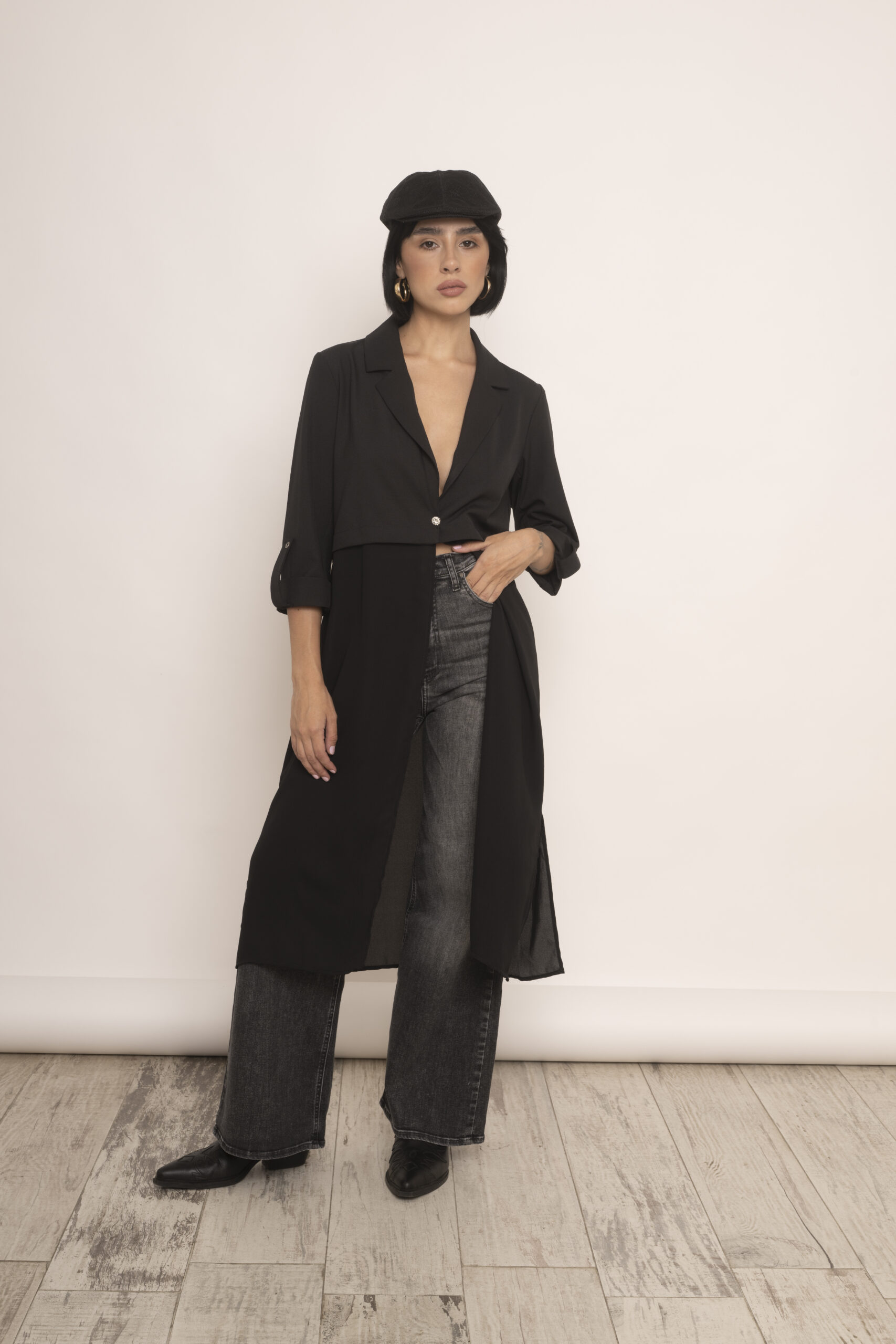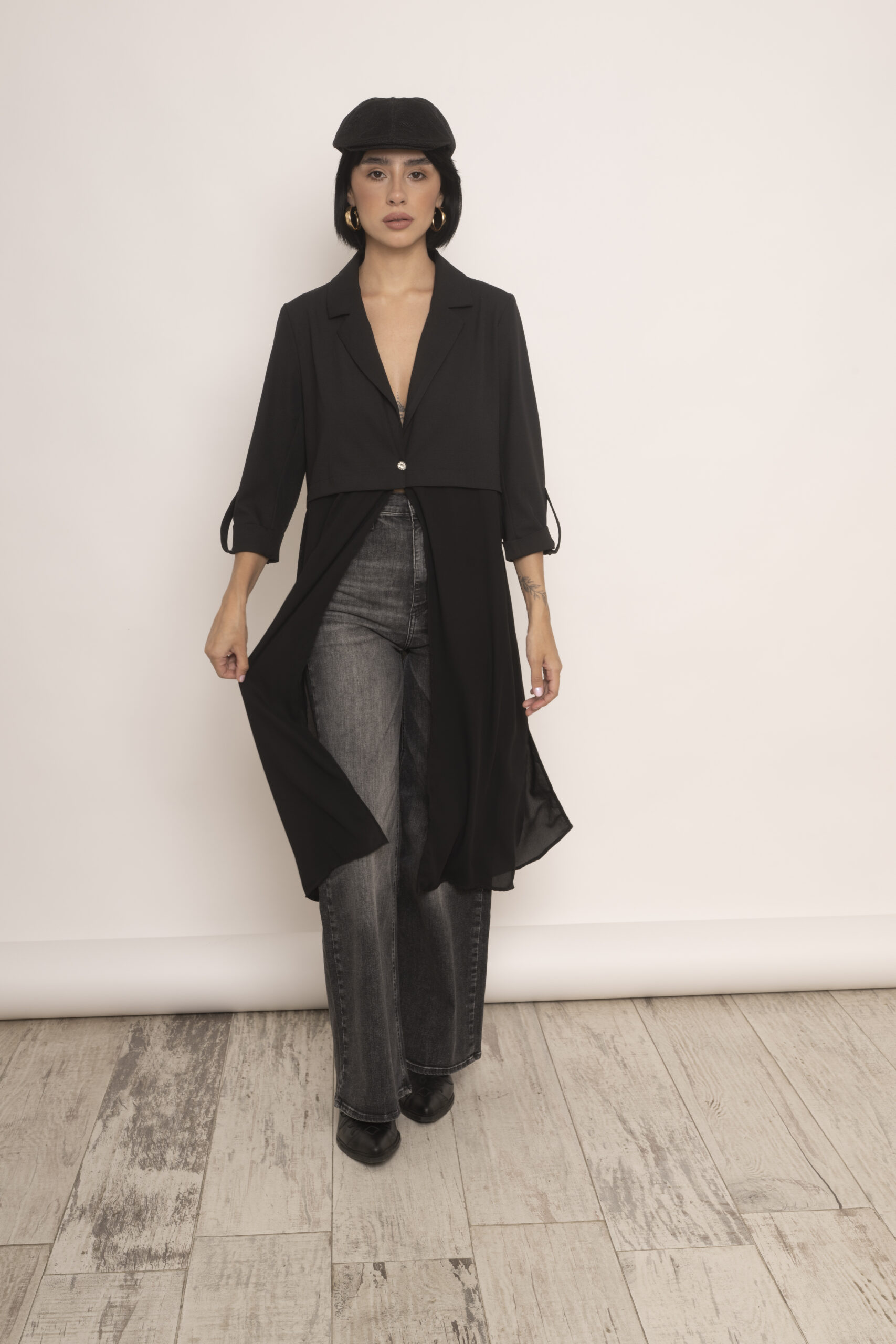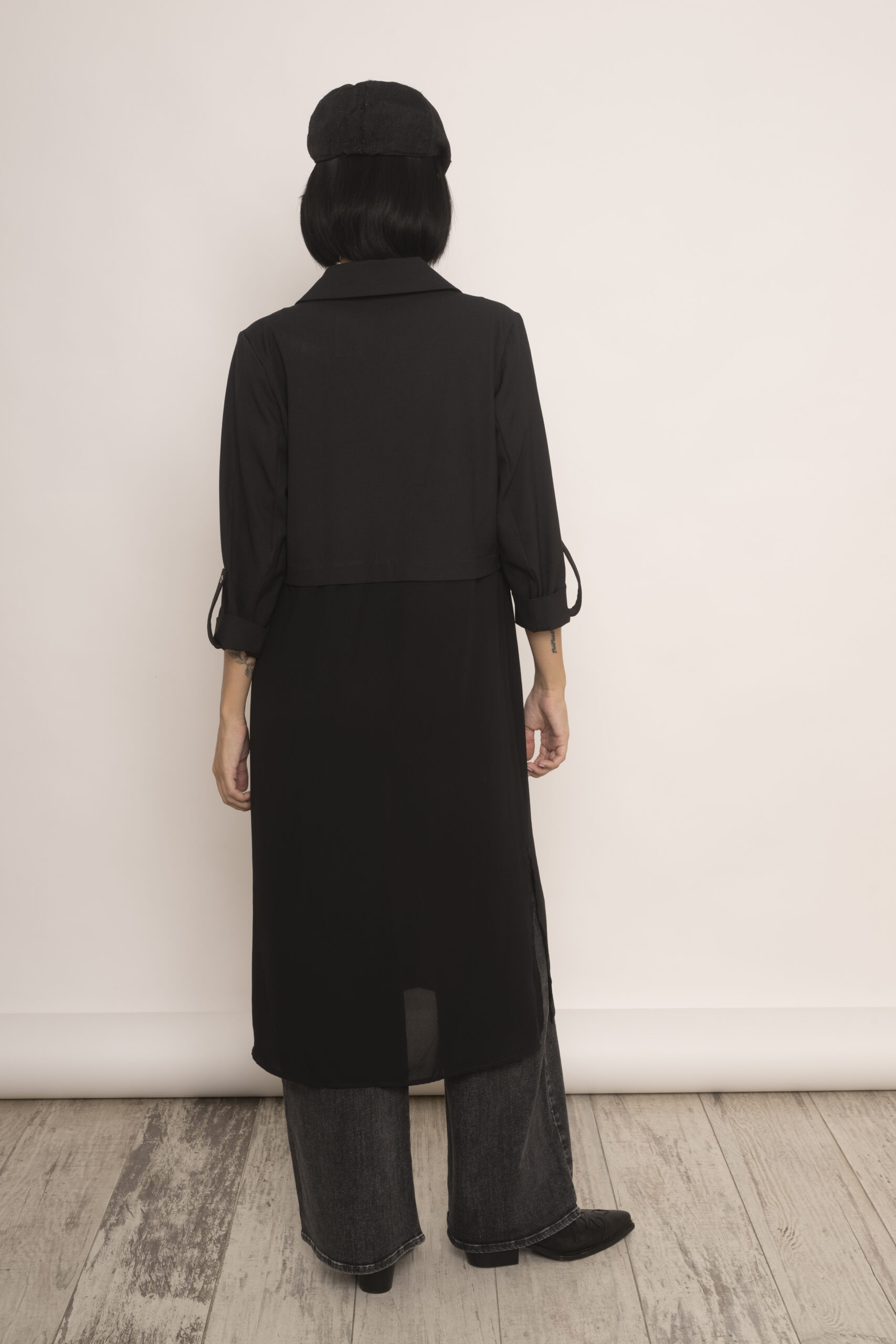 Blazer largo confeccionado en crepe sin forrar, envivado en su interior y en gasa negra transparente en el largo. Es un modelo ideal para usar como kimono pero al tener formato de blazer o chaqueta lo hace super fino y delicado. Lo podes usar con jeans, ropa de vestir, con lo que quieras porque se adapta a todo uso.