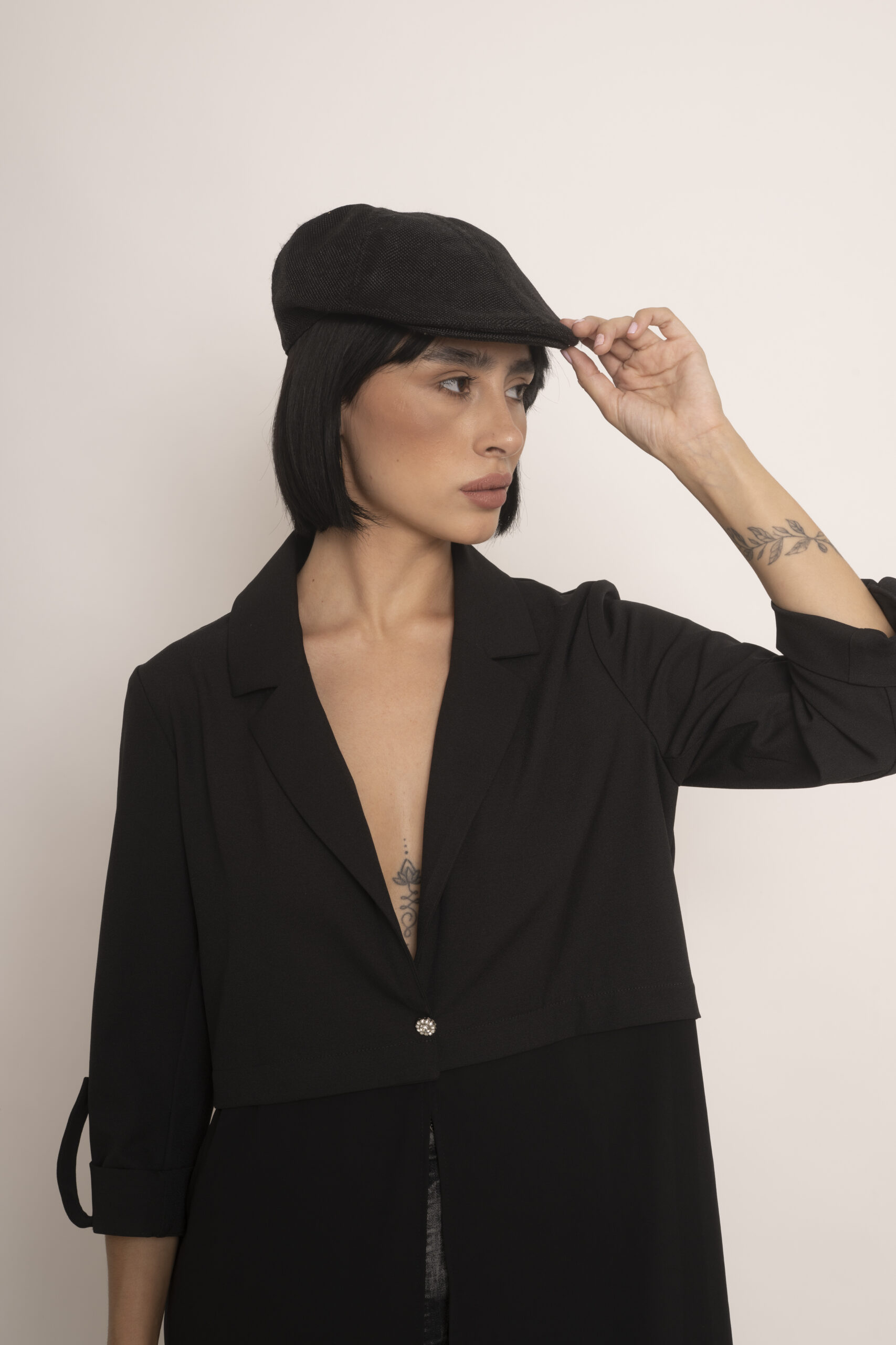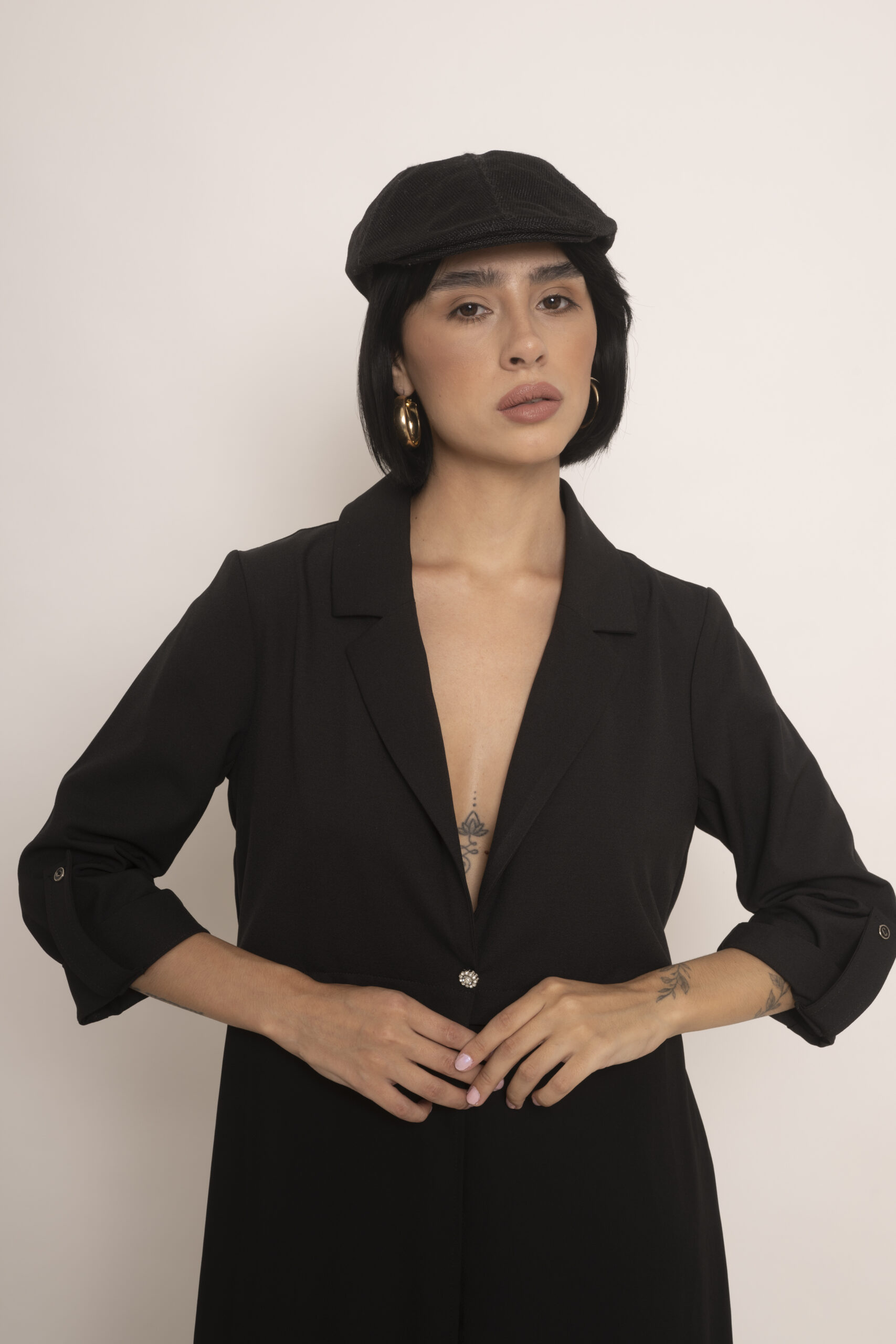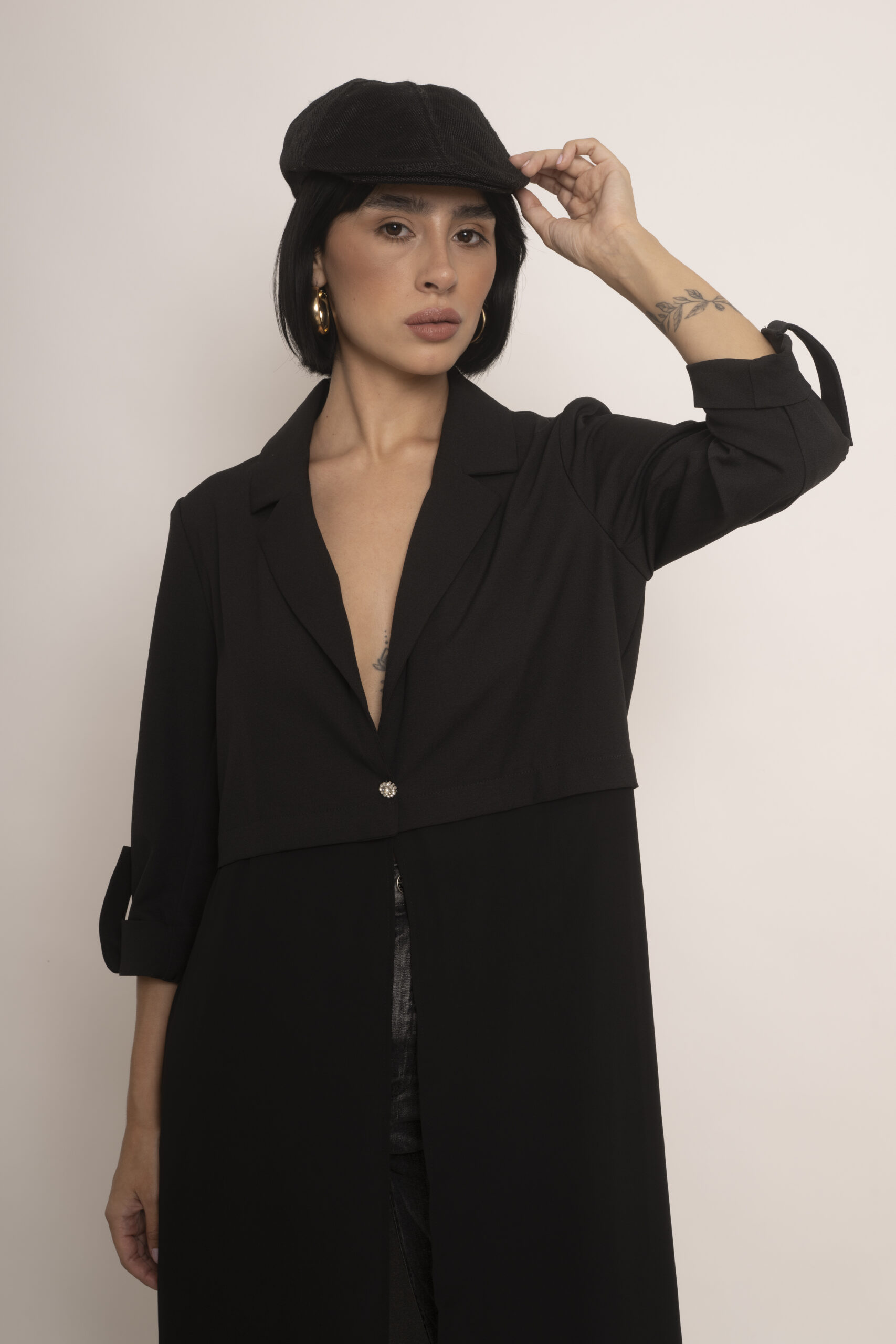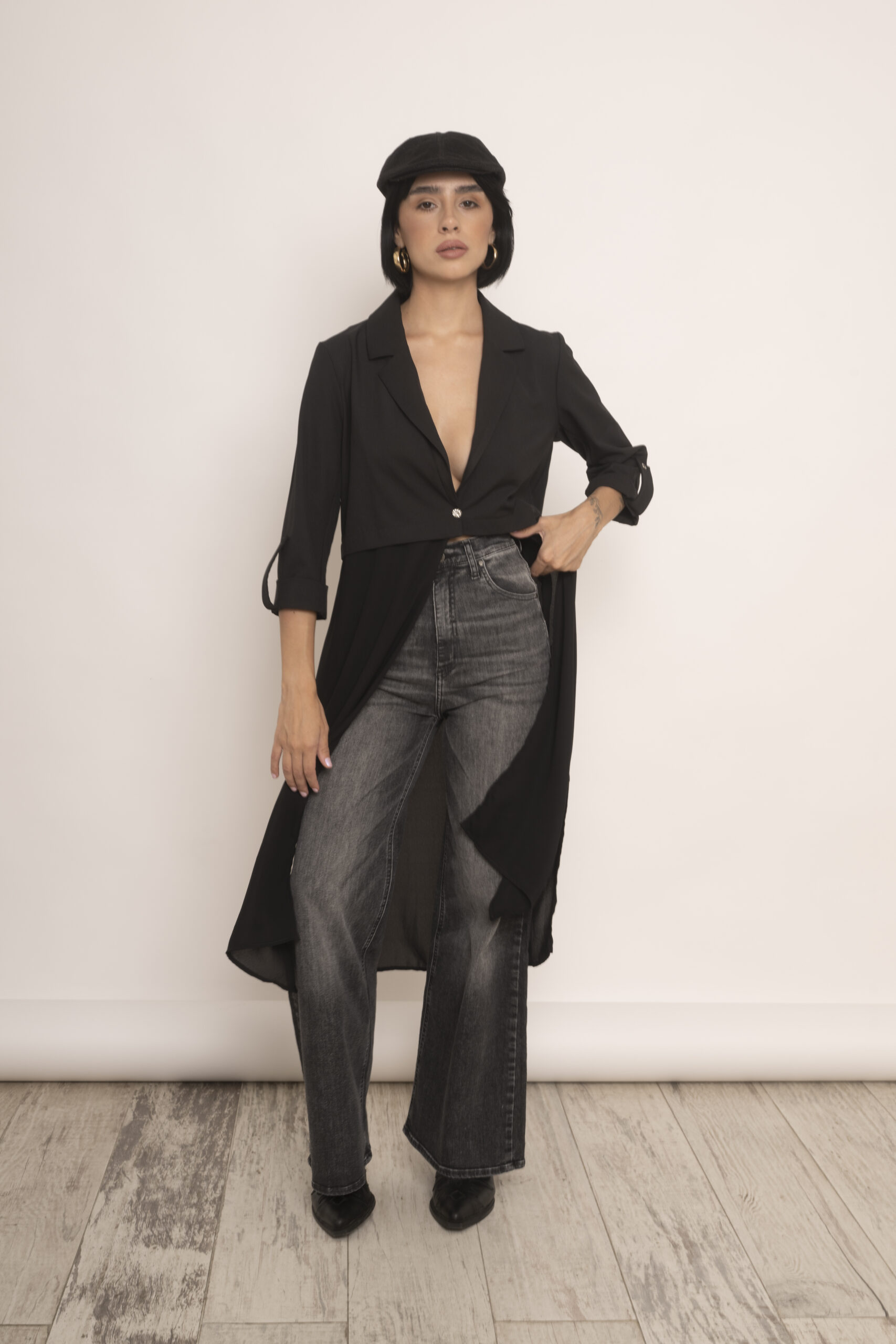 Blazer largo confeccionado en crepe sin forrar, envivado en su interior y en gasa negra transparente en el largo. Es un modelo ideal para usar como kimono pero al tener formato de blazer o chaqueta lo hace super fino y delicado. Lo podes usar con jeans, ropa de vestir, con lo que quieras porque se adapta a todo uso.