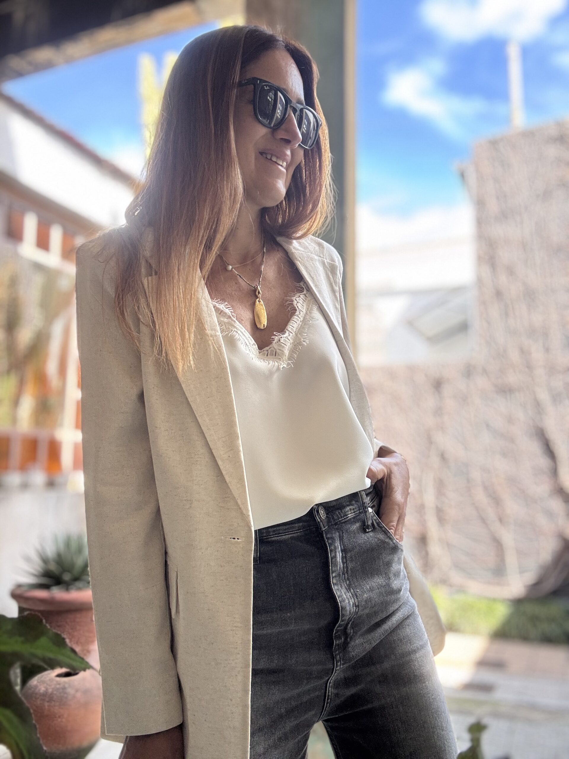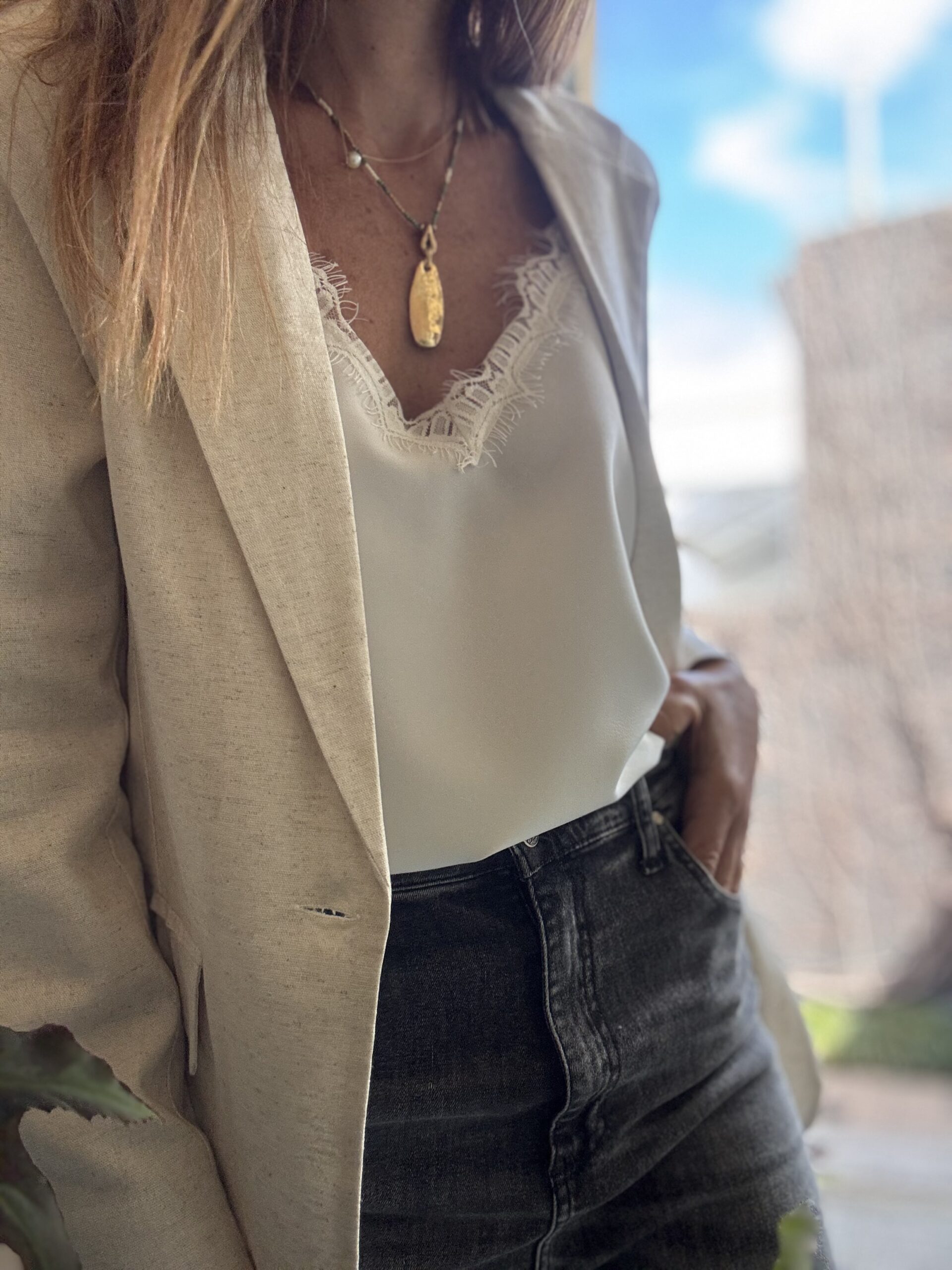 Blusa con puntilla importada. Tajos laterales, más larga en la espalda.