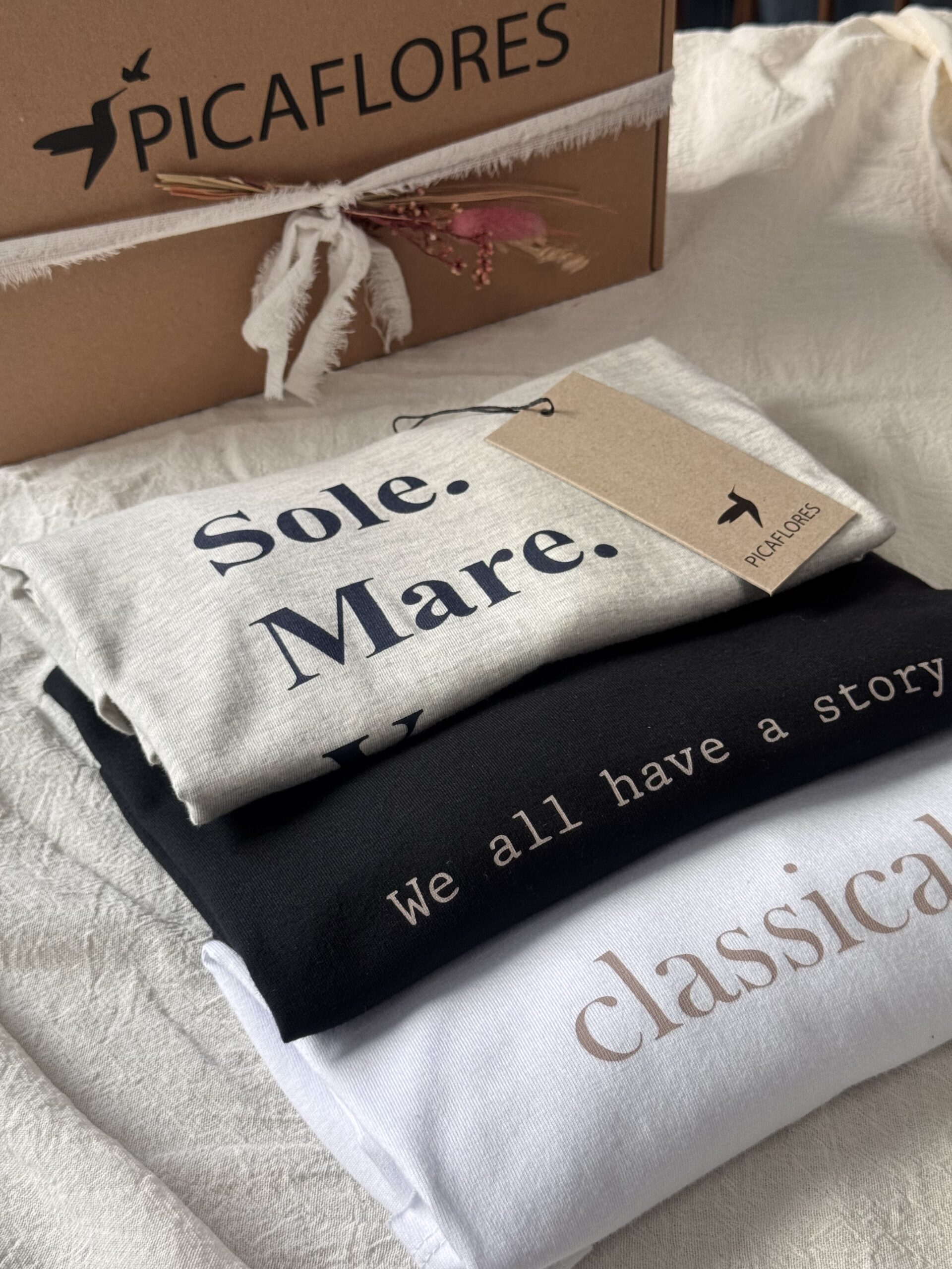 3 remeras de mangas cortas estampadas a elección (Classical, Je ne sais qua Sole Mare, 1970, We all have a story).