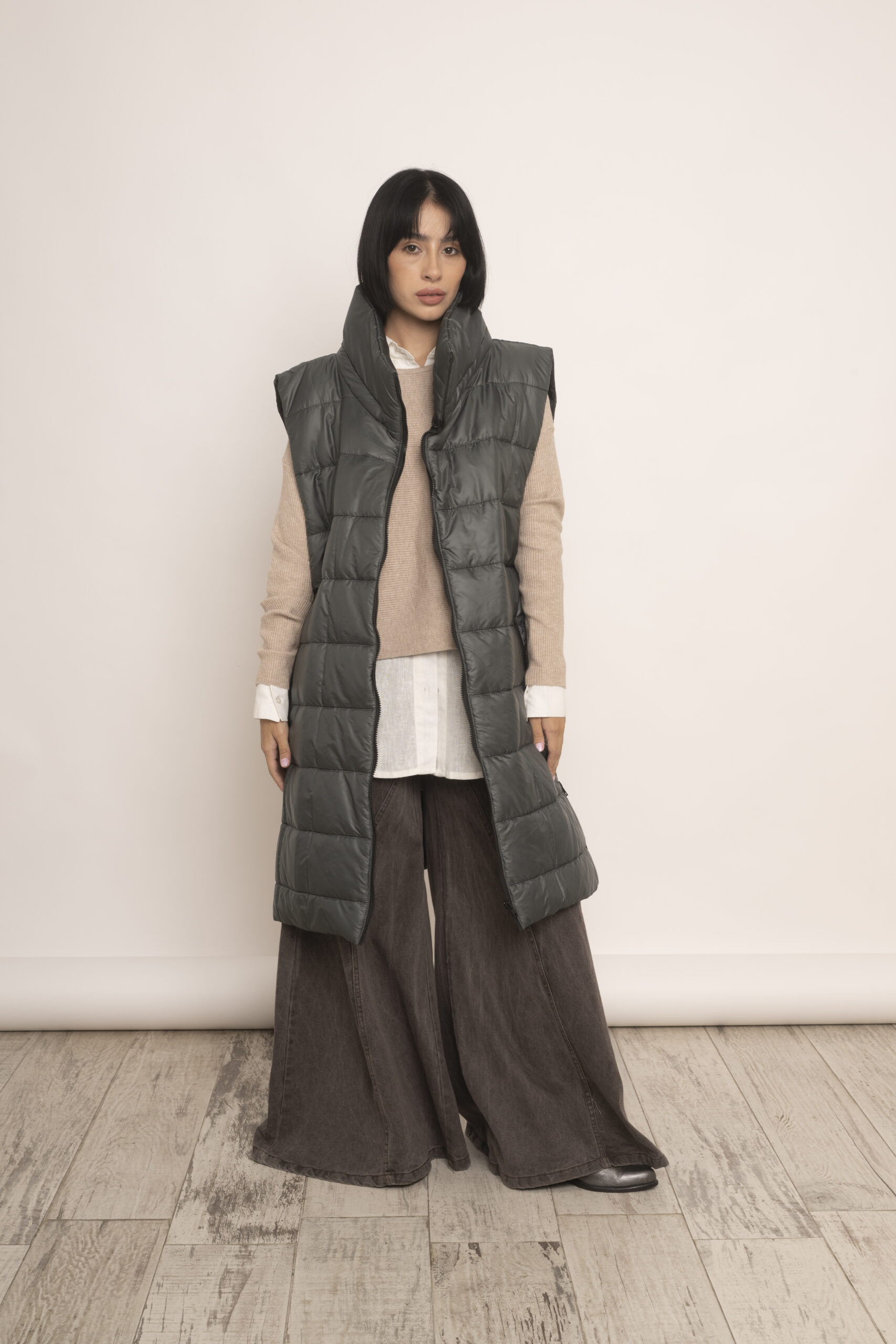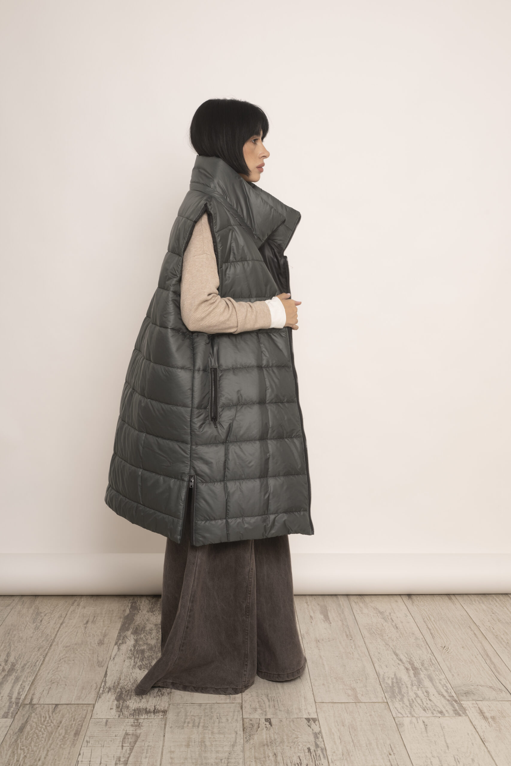 Chaleco largo con maxi cuello en matelasse con guata forrado en su interior con siré.  Cierre frontal, bolsillos con cierres y cierres laterales para darle más apertura.  Super calentito.
