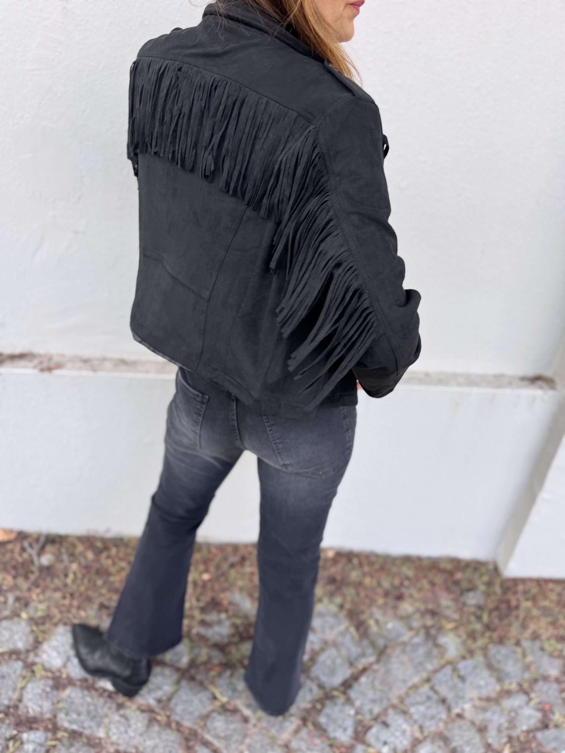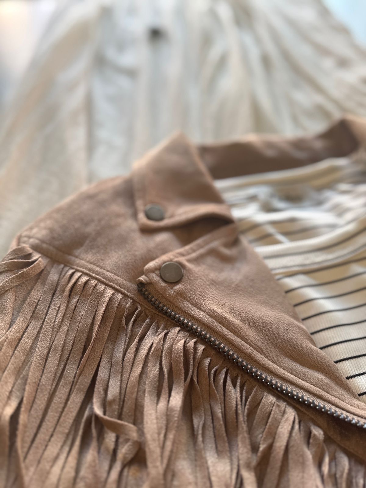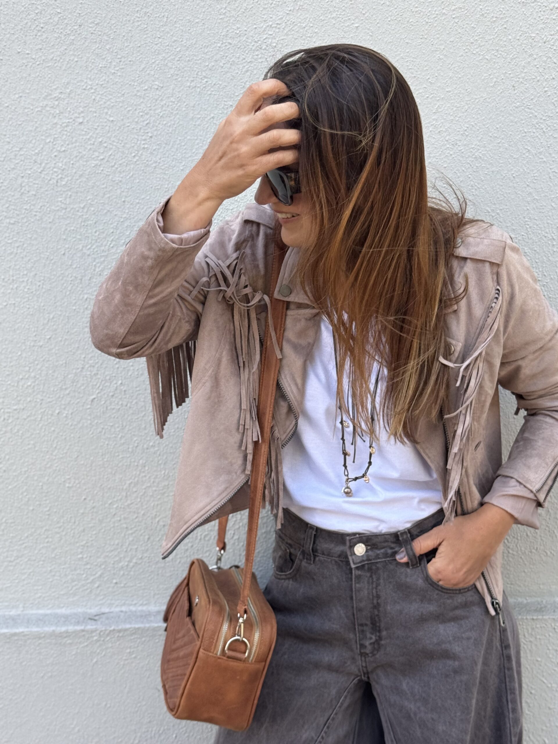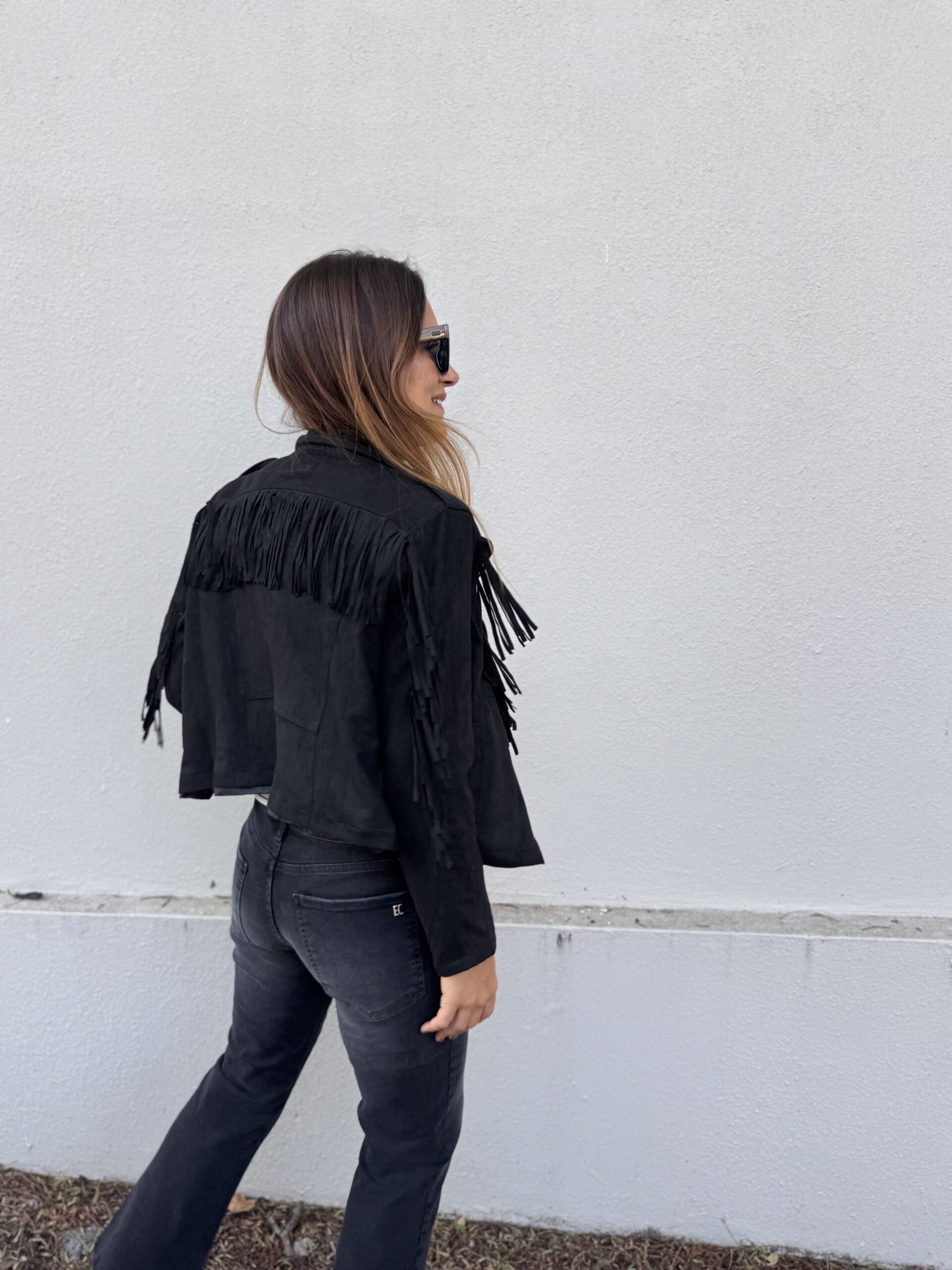 Chaqueta confeccionada en eco gamuza de tacto suave y textura aterciopelada. Su diseño se destaca por los flecos aplicados en la parte delantera y trasera, que aportan movimiento y personalidad a la prenda