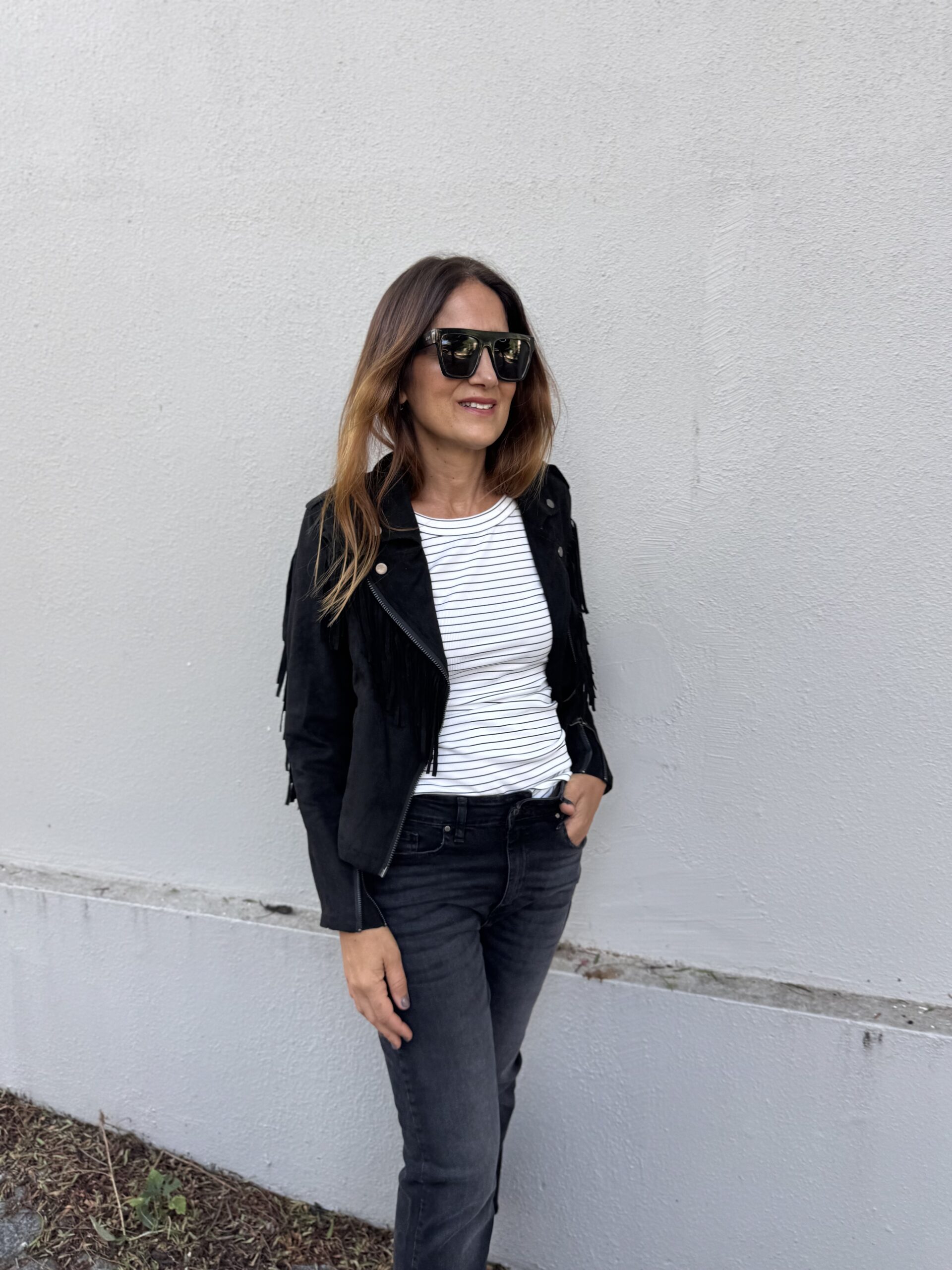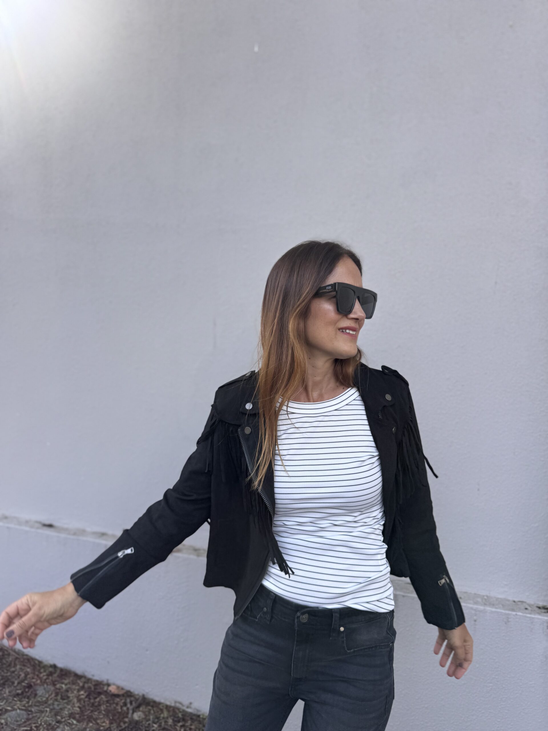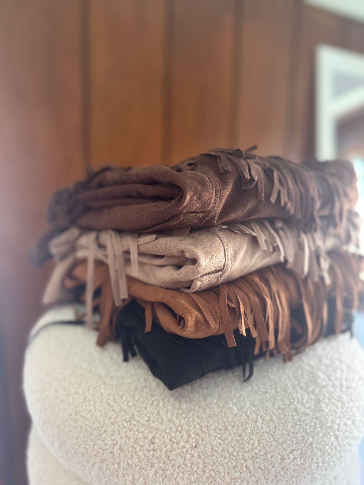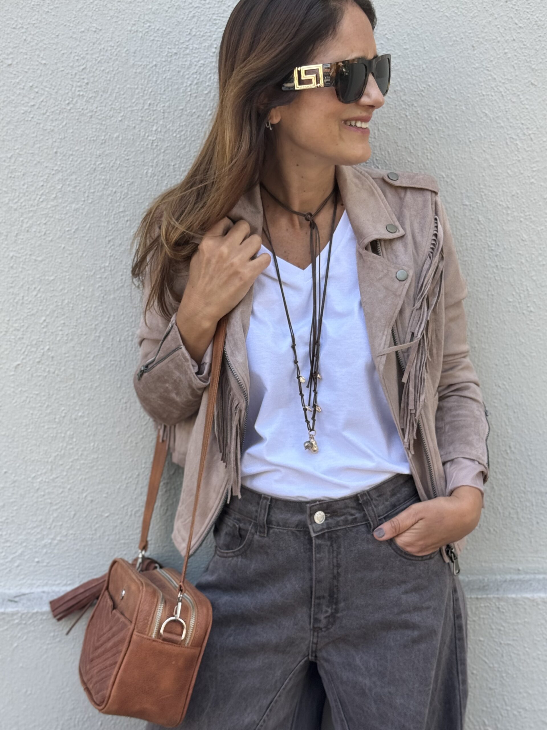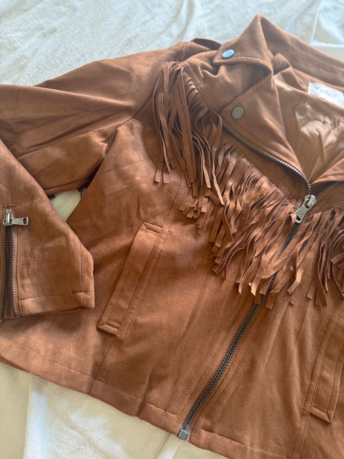Chaqueta confeccionada en eco gamuza de tacto suave y textura aterciopelada. Su diseño se destaca por los flecos aplicados en la parte delantera y trasera, que aportan movimiento y personalidad a la prenda