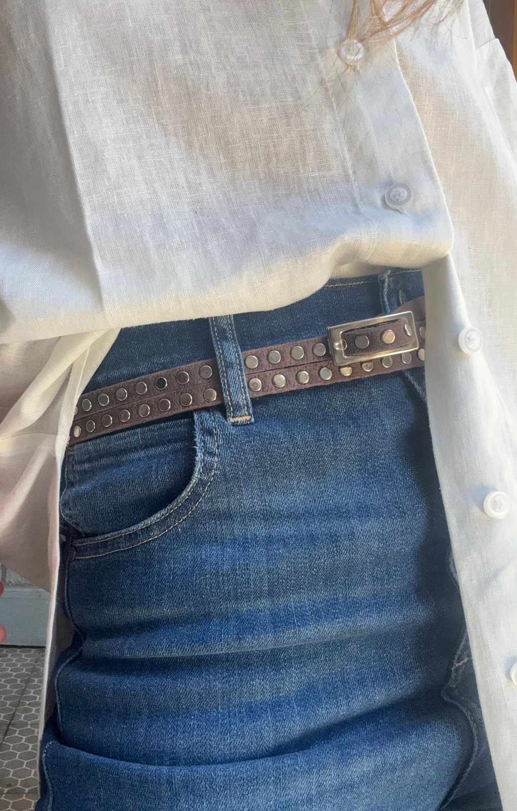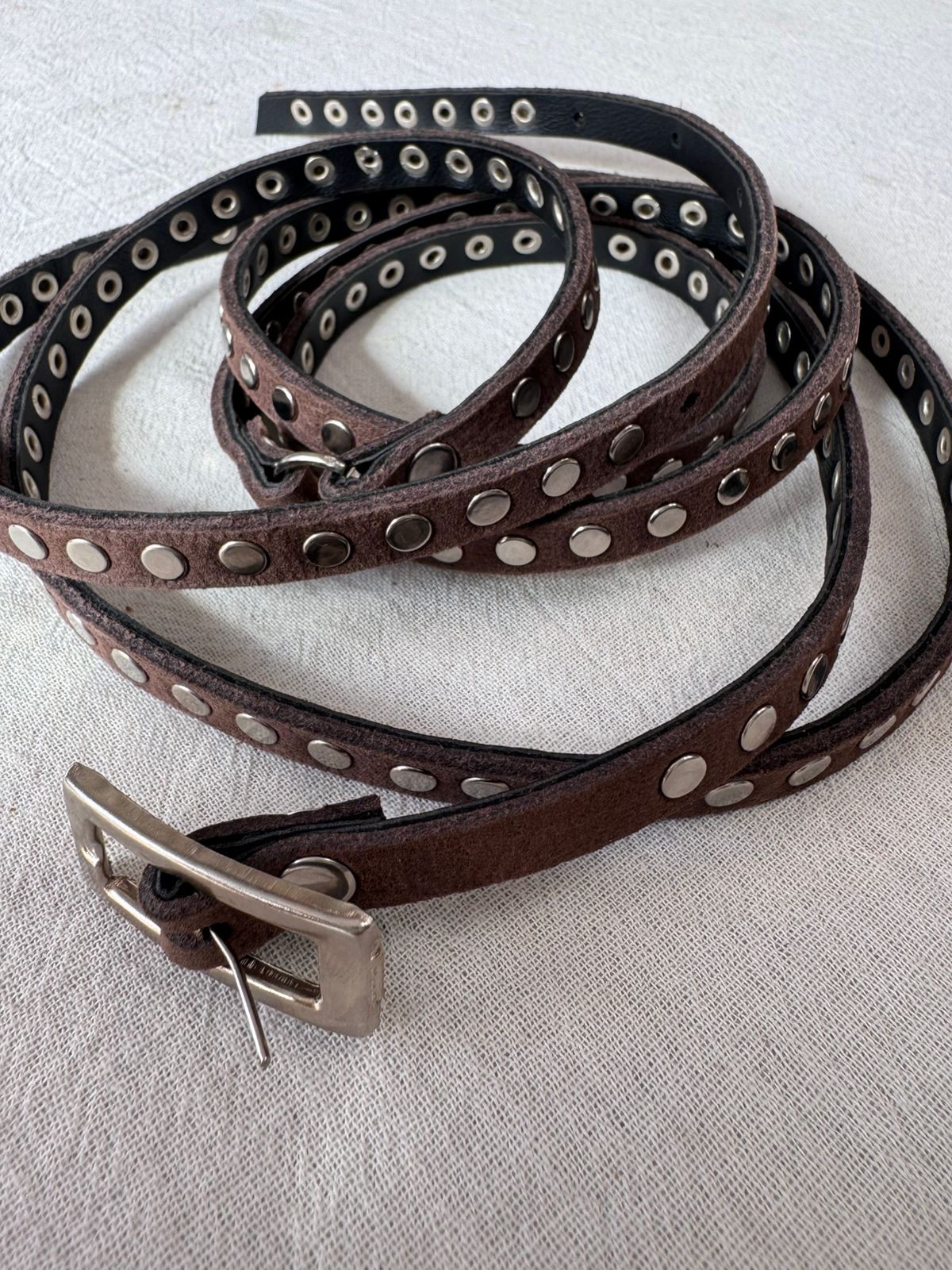 Cinturón doble vuelta, 100% cuero, con multi tachas en toda su extensión. Color chocolate. Podes perforarlo según tu necesidad.