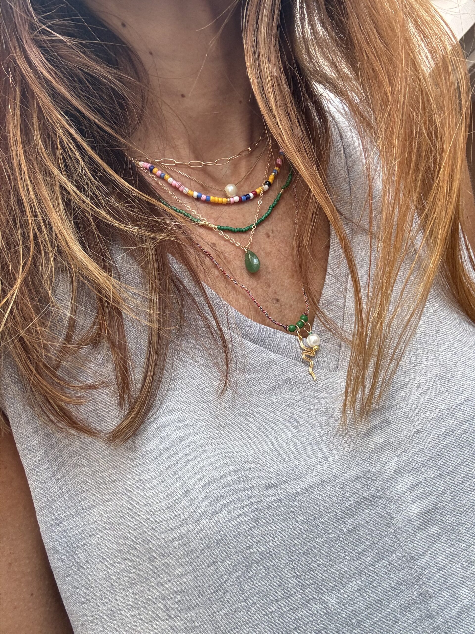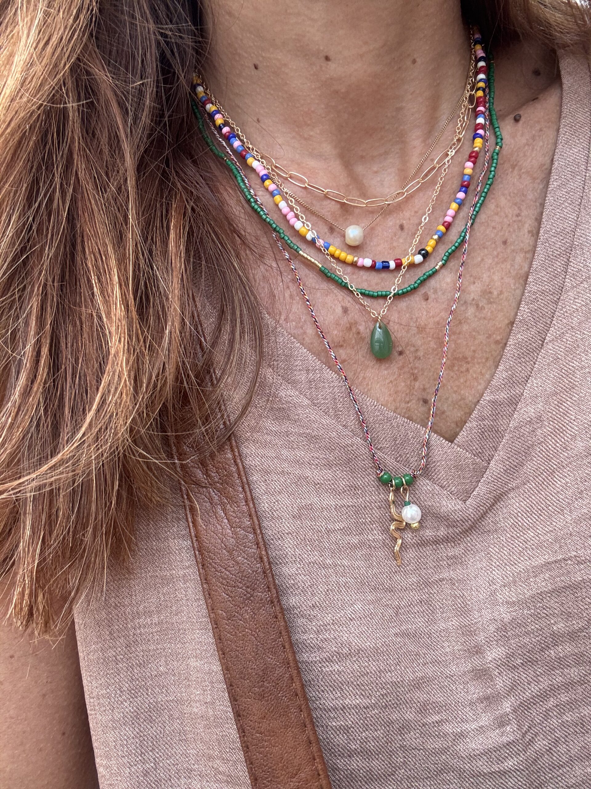 -colgante de hilo de seda con dije de víbora, perla y canutillos verde de mar