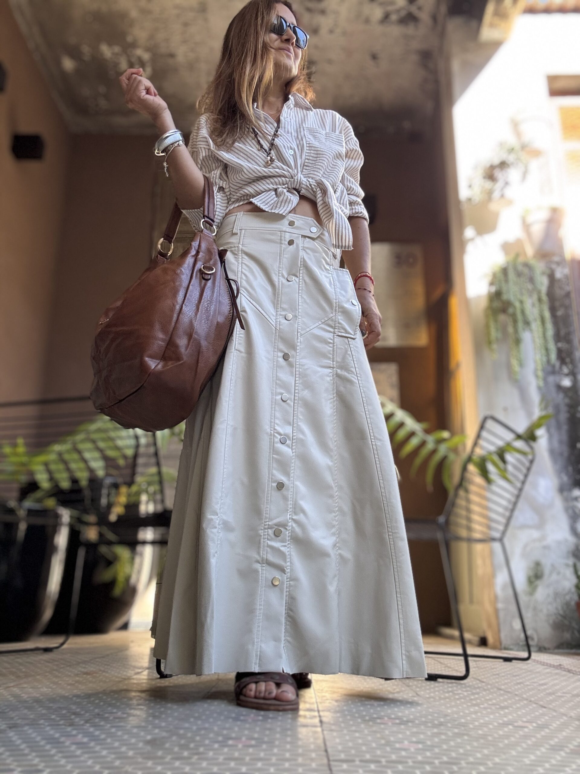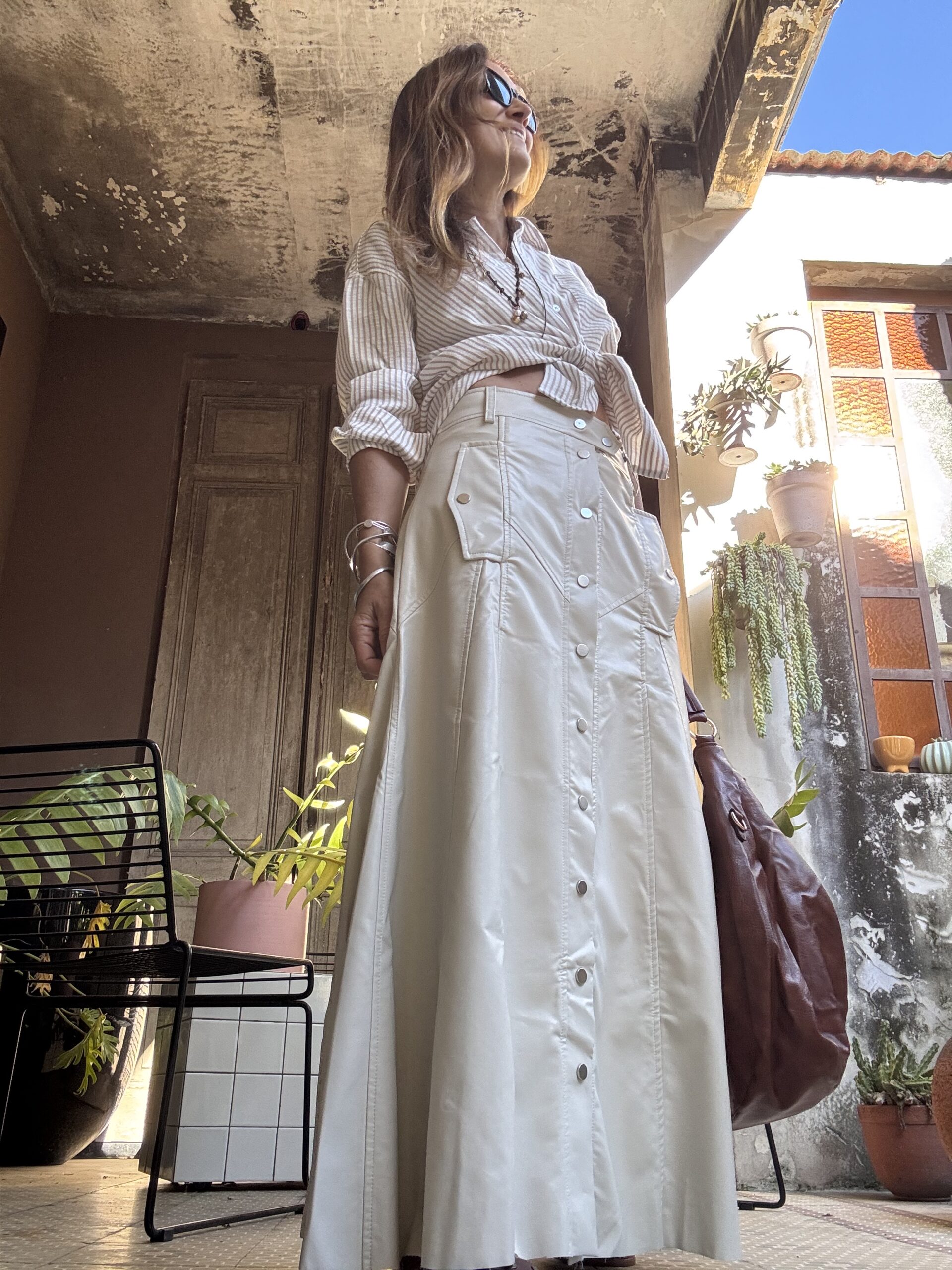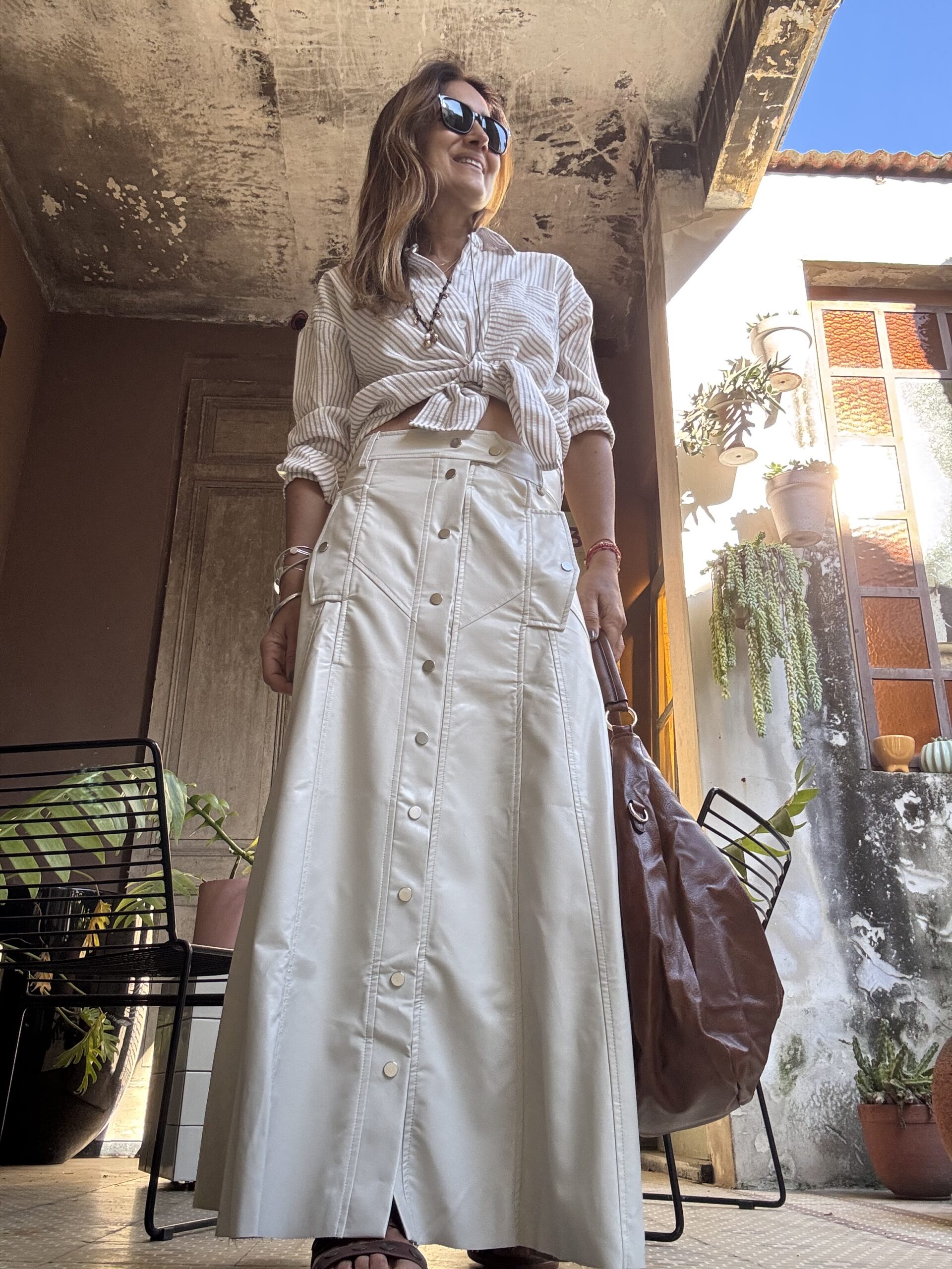 Falda de cuero ecológico, super suave al tacto. Broches de metal en el largo. Detalles de costuras que la hacen super moderna. Bolsillos laterales y traseros.