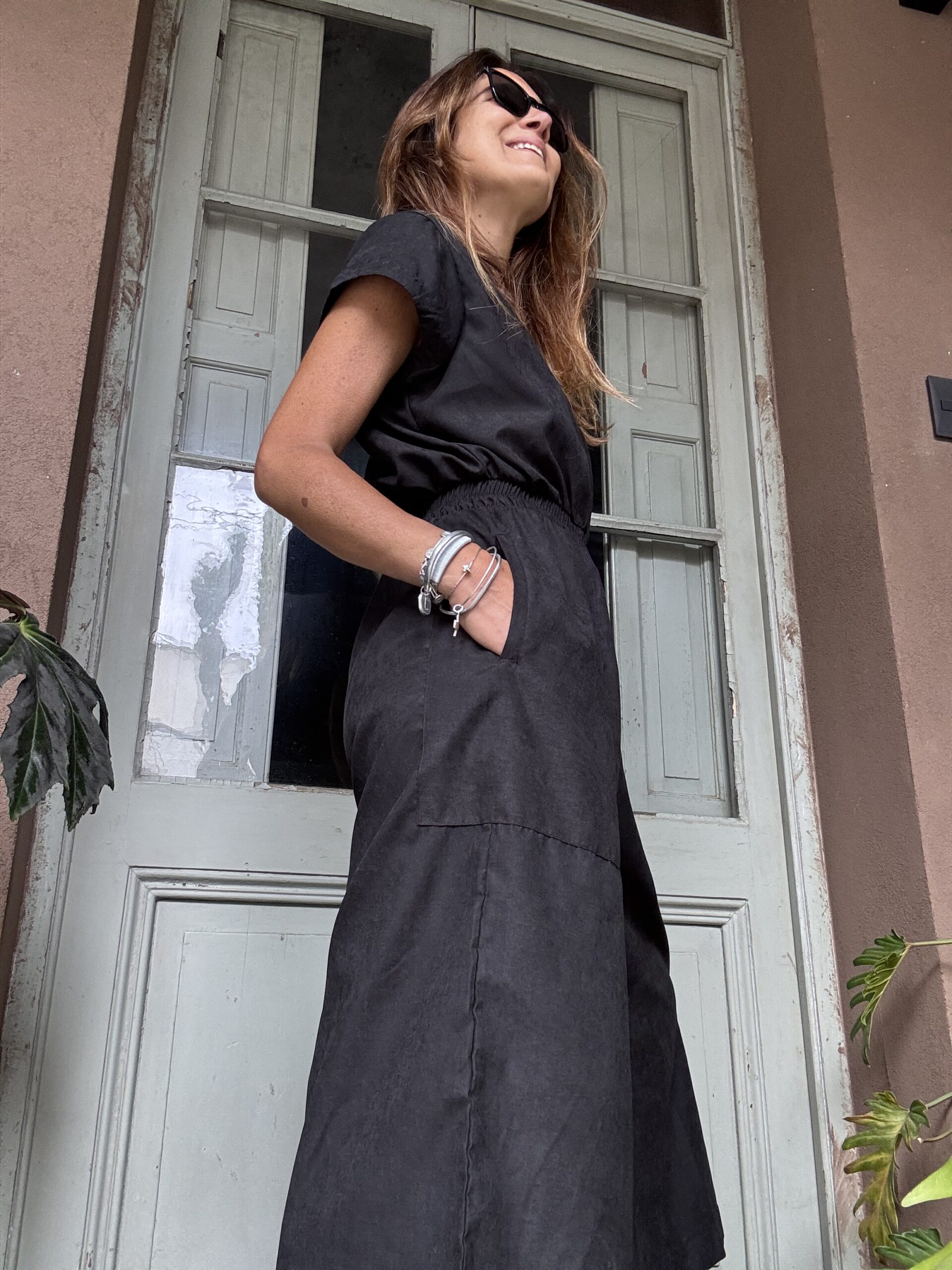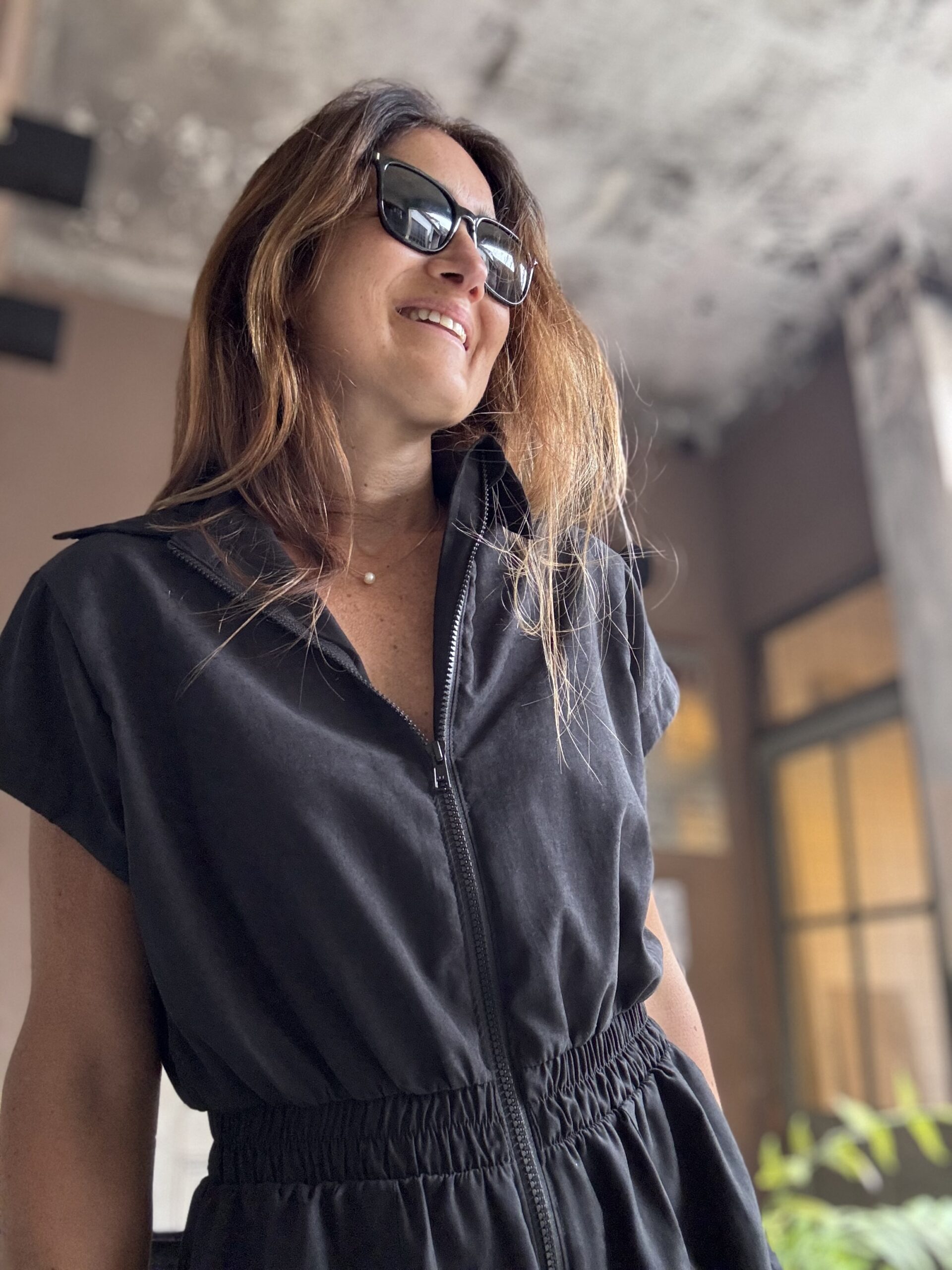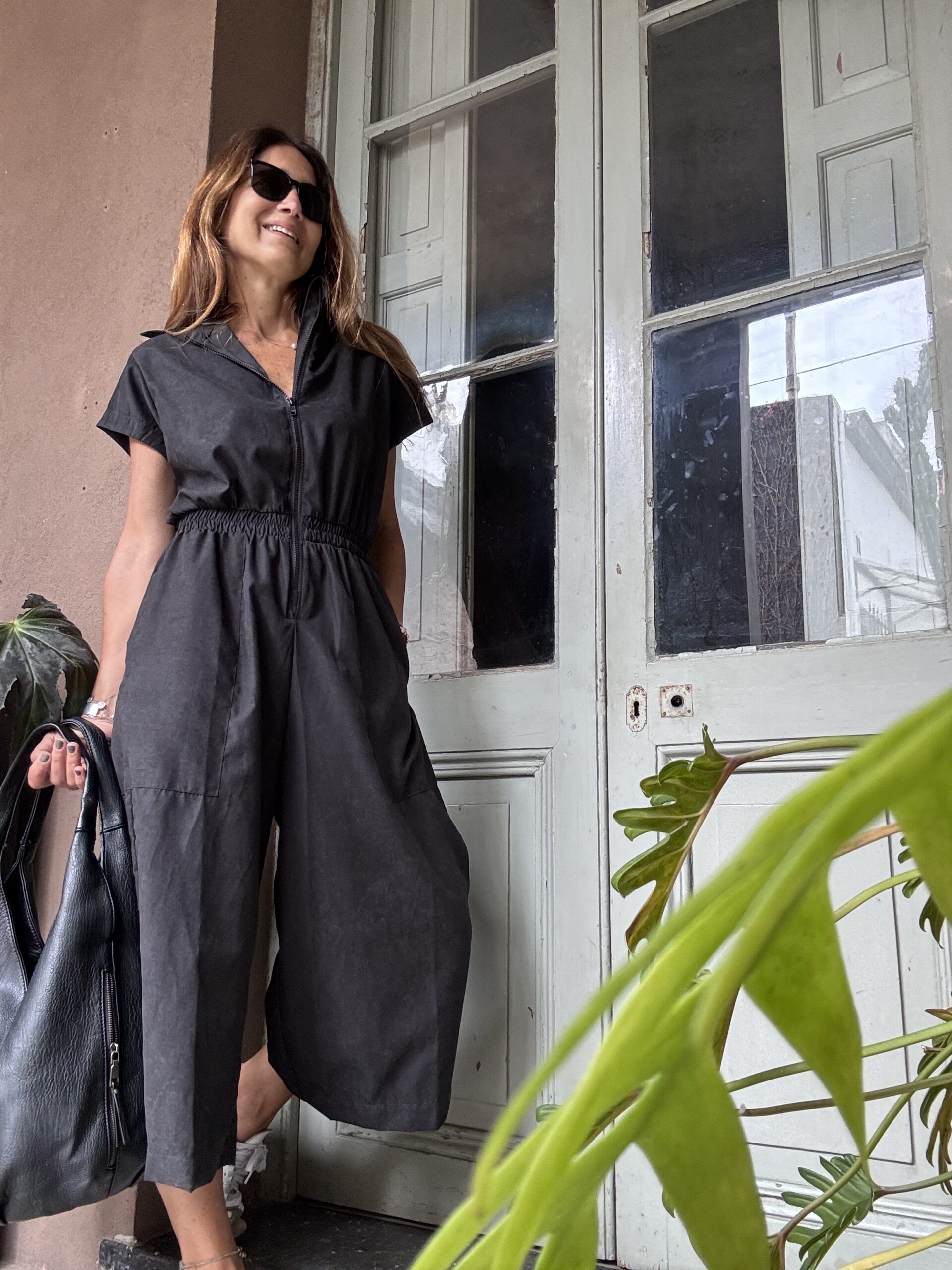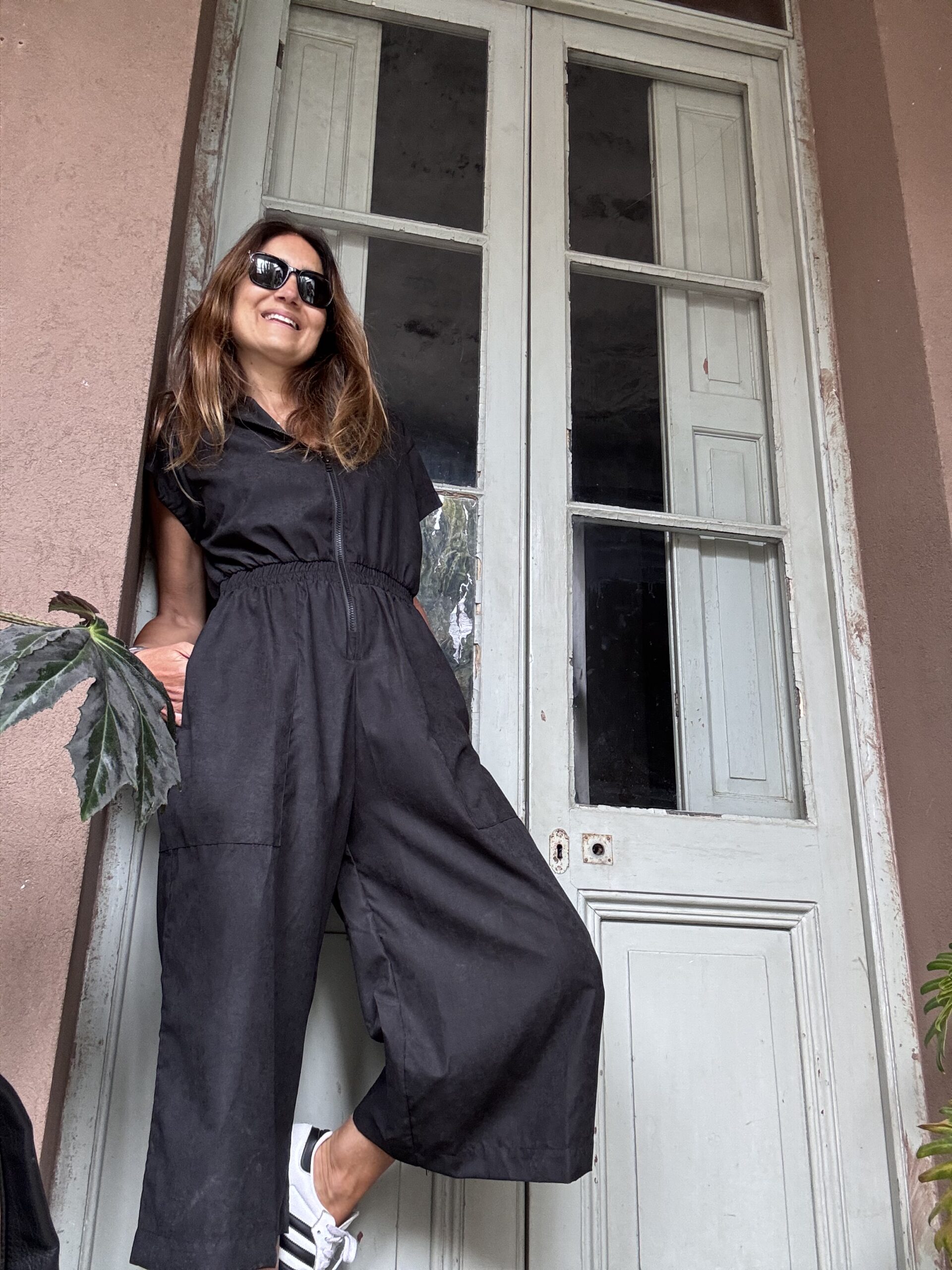 Mono negro manga corta, con cierre frontal. De corte relajado y diseño versátil. Combina comodidad y estilo en un solo look.