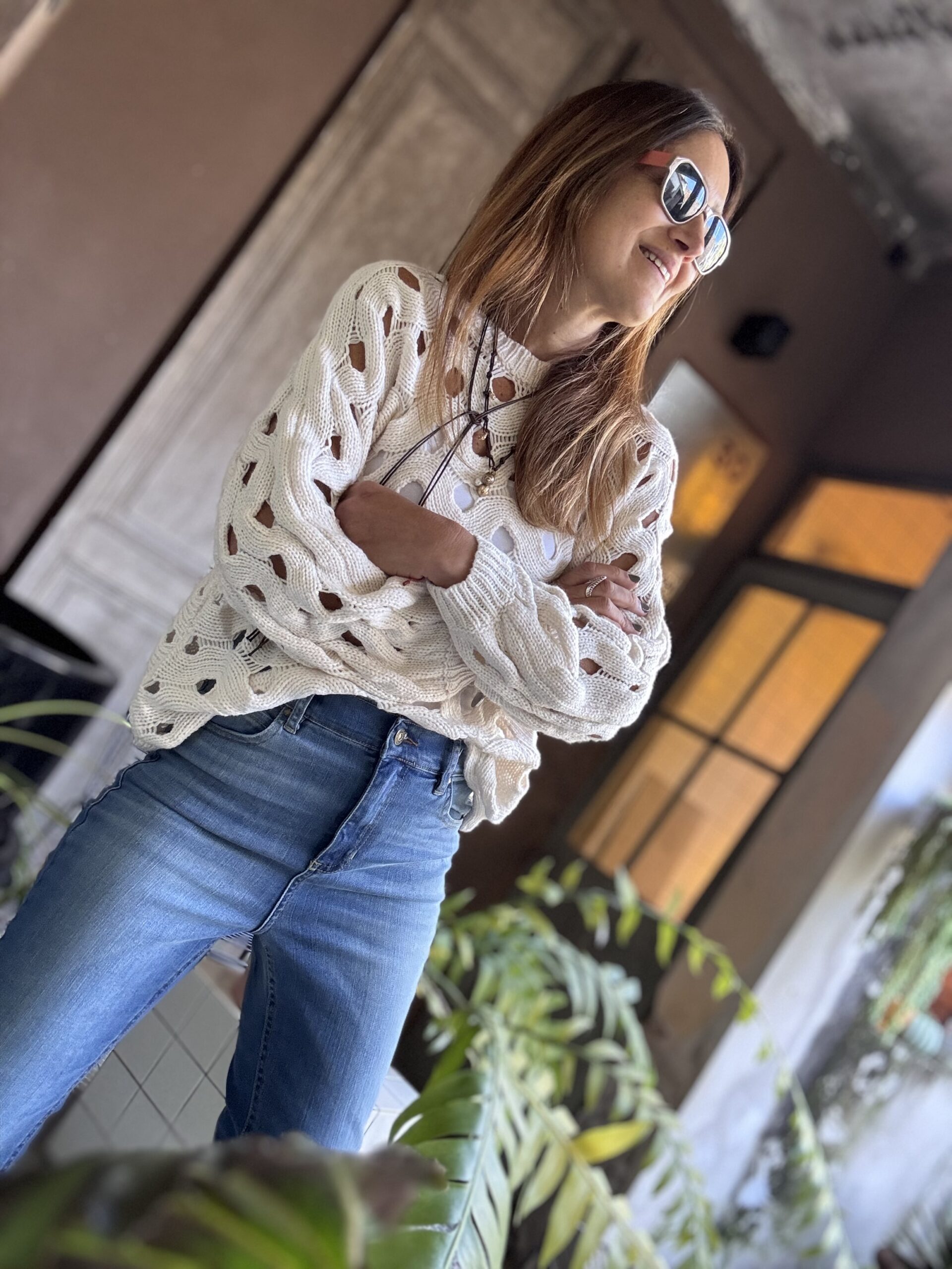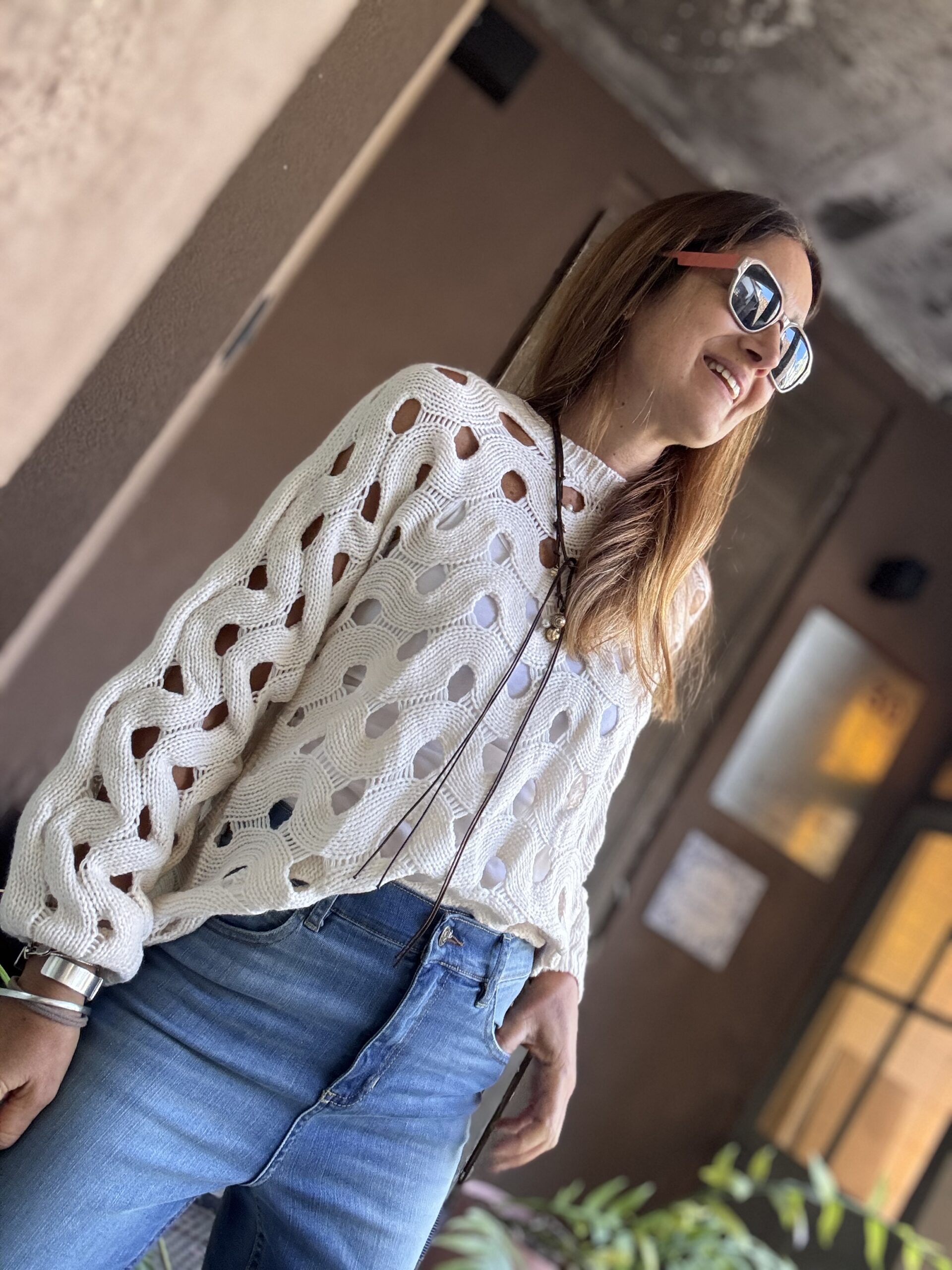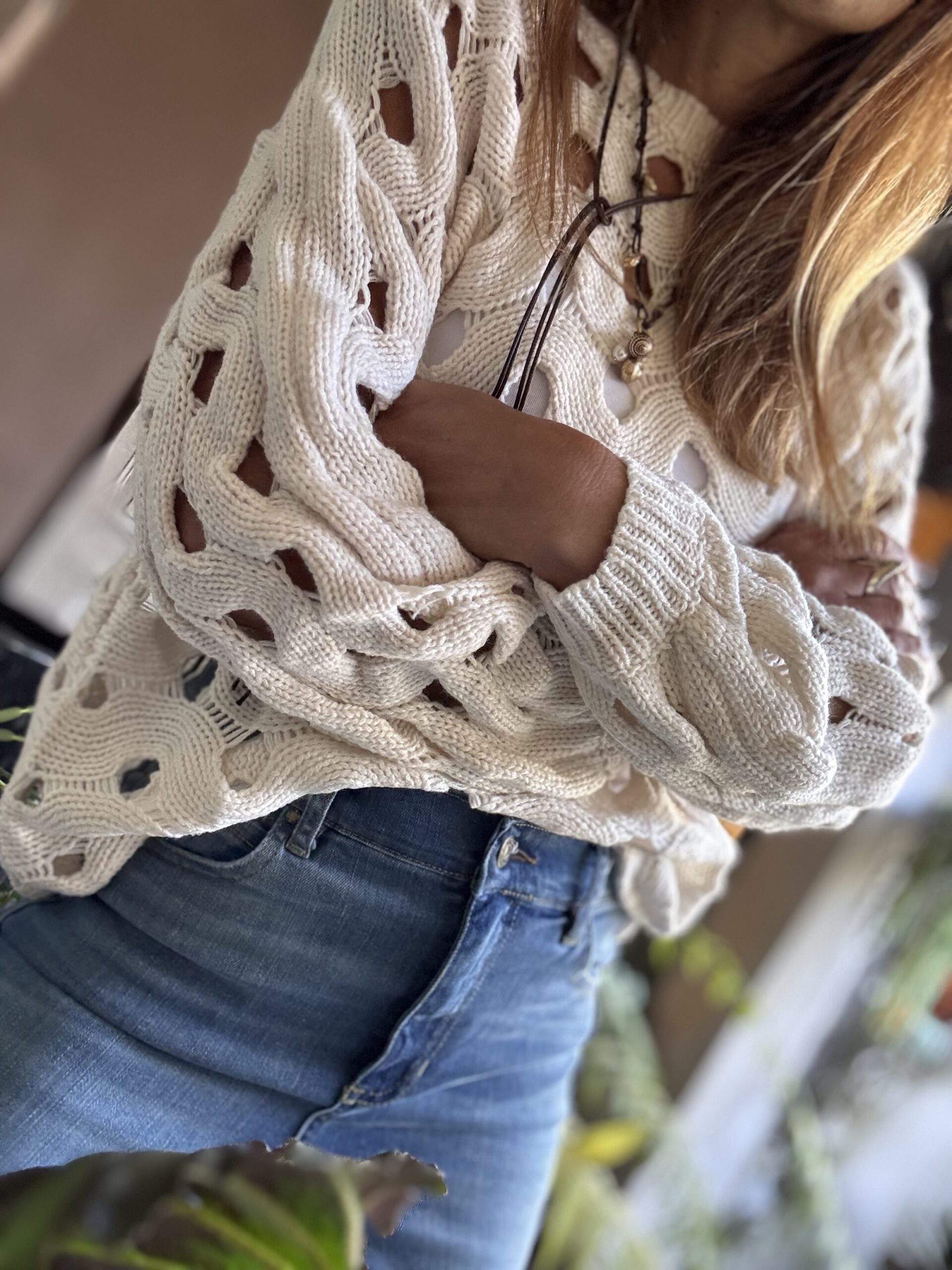 Sweater tejido en color crudo, calado en forma entrelazada, dándole un estilo llamativo y artesanal.