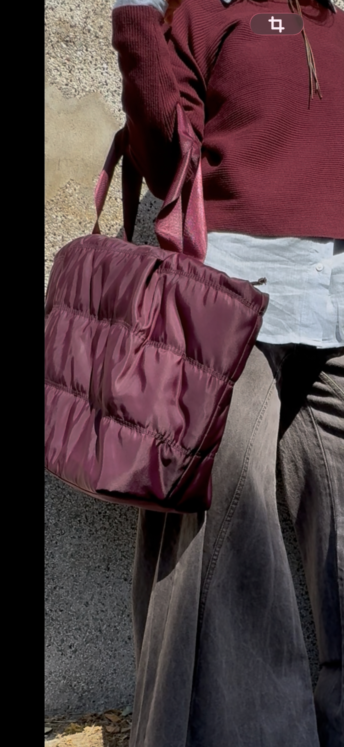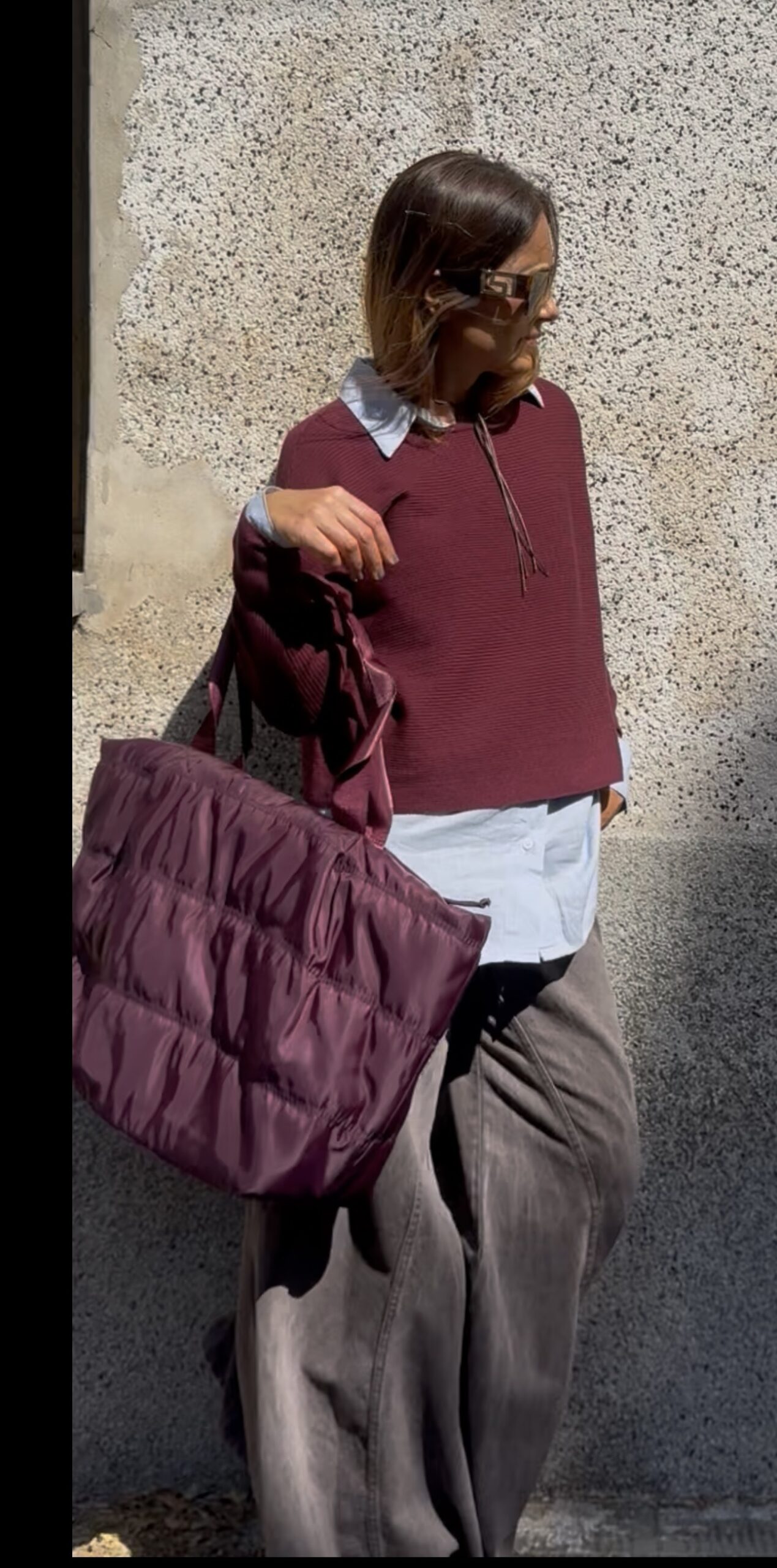 Bolso tipo tote acolchado en color bordó. Está confeccionado en un material liviano y resistente al agua. Tiene acabado satinado.