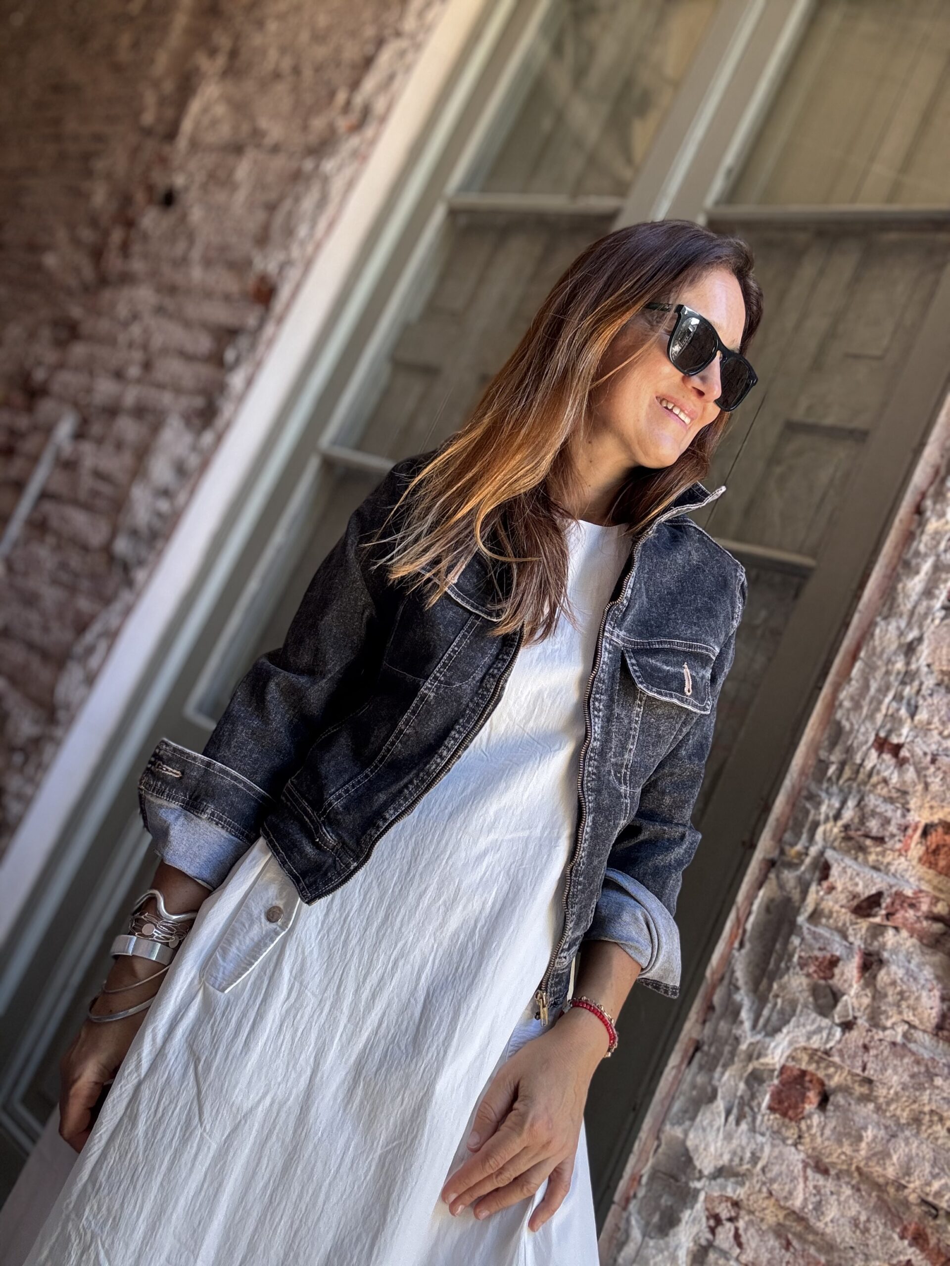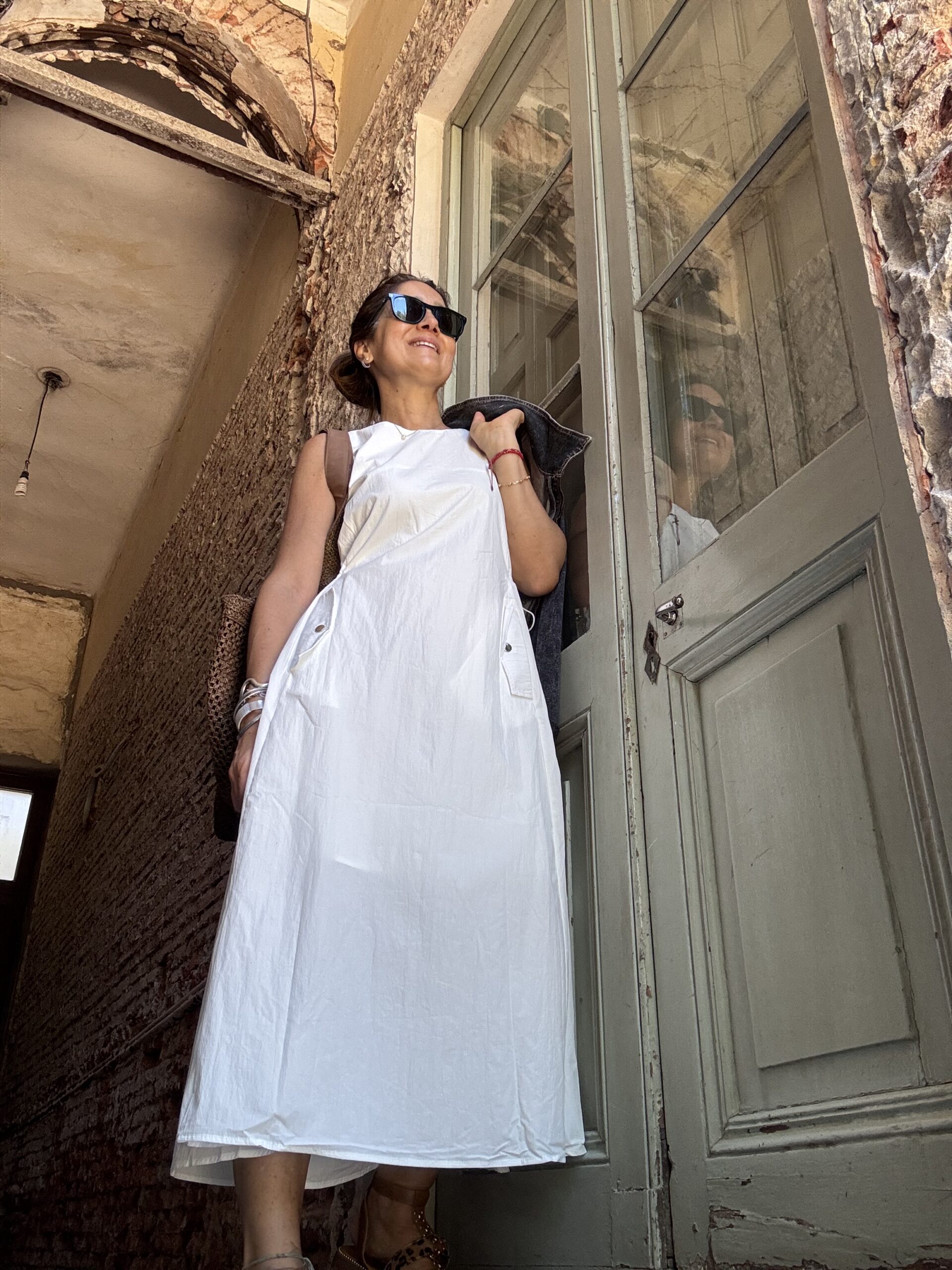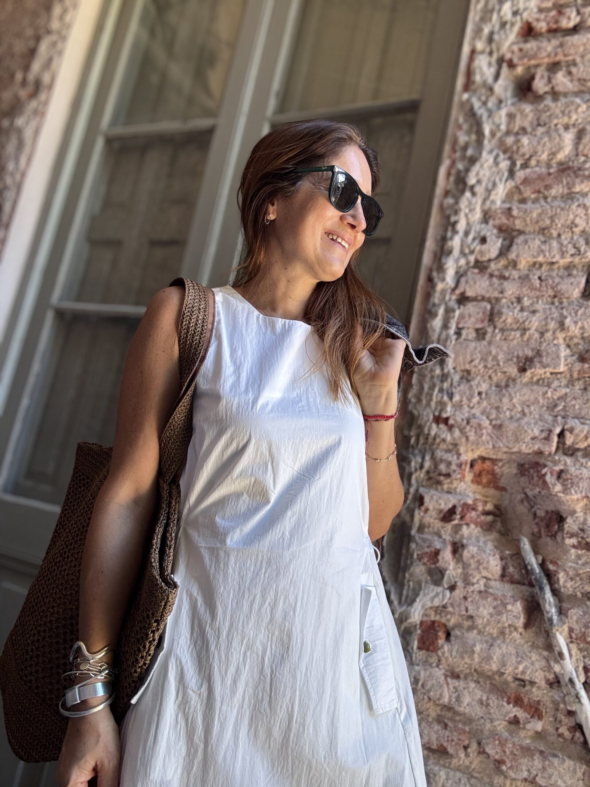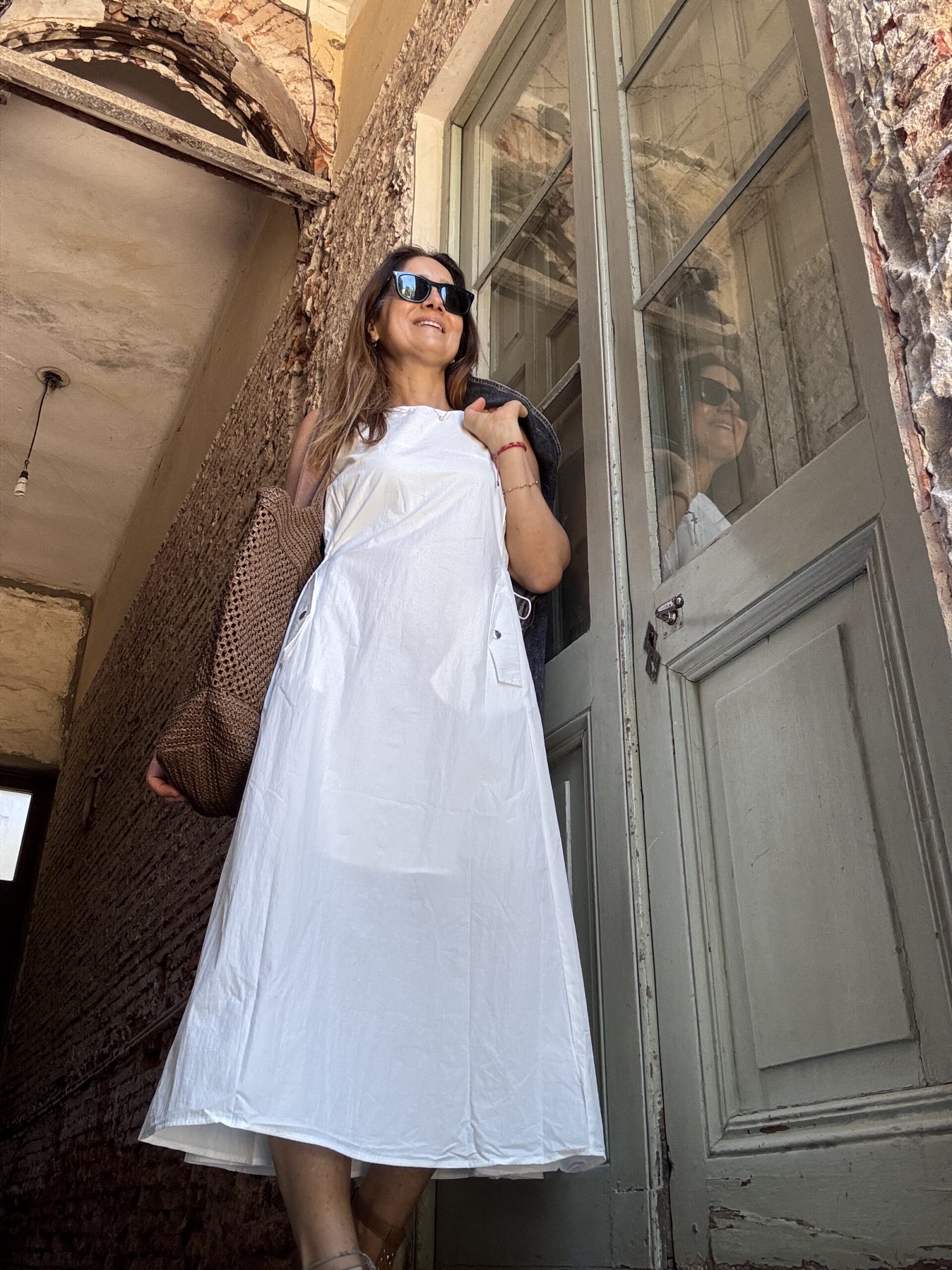 Vestido amplio con cintura regulable y bolsillos en el frente. Confeccionado en sire.  Incluye enagua.